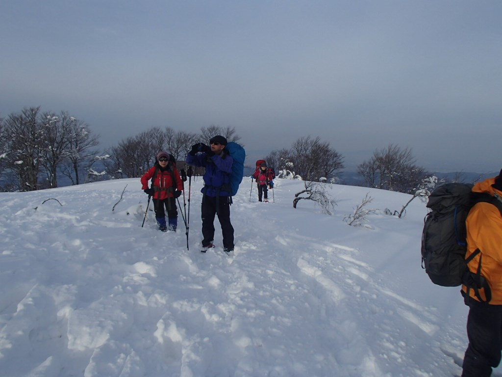 3合目で一息入れ、その後は傾斜が緩みマイペースで登ることができる。積雪はそれなりだが、先行隊のおかげでかんじきを履くことなく山頂小屋に到着することができた。丁度小屋に到着すると日帰り組の4人と合流、昼休憩を済ませ、山頂を踏んでこれから下るところだった。小屋の中には今日宿泊する某山岳会NBの方達が3名おられ、挨拶を済ませて1Fにフライシートを張り、食事の支度をする。時間はたっぷりとあり、担ぎ上げたビールと日本酒で宴会を開始する。