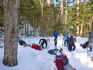 8テンと大鍋、大量の食材と酒を担いで、快晴の中を歩き始めます。予想外に暖かく、積雪も少なくて、ザックが重い以外は快適に歩けます。途中何回か休憩を取りながら、ほぼコースタイム通りに本沢温泉に到着しました。