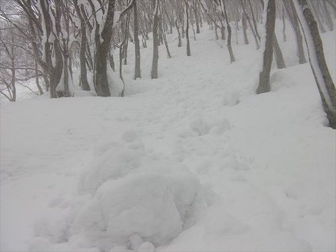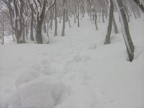 このトラバースルートは,雪庇の崩れによる雪崩の走路となっている.