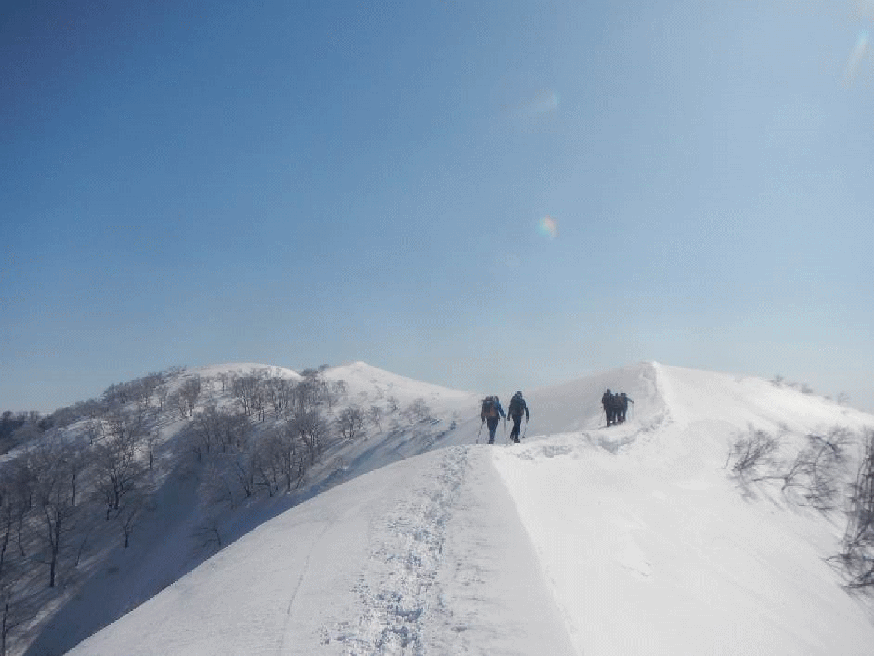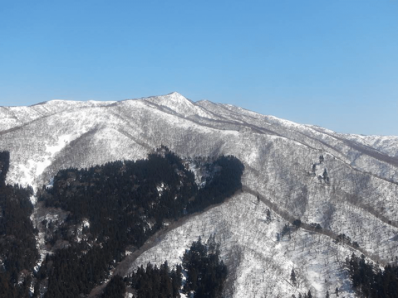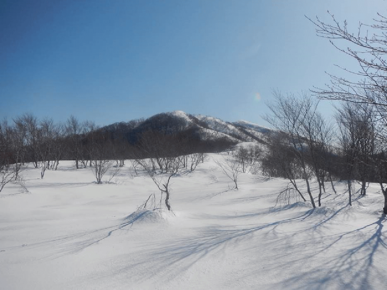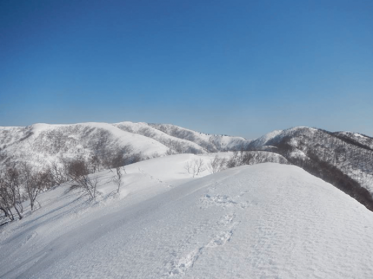 菅名山塊は標高千メートルに満たない。尾根もそれほど複雑でなく、主稜線はなだらか。積雪期は私にとって楽しめる山域となる。今回は特に素晴らしい天気で、雪は適度に締まっており歩きやすい。春陽はすべてを輝かせて見せてくれる。なぜか休むのがもったいないと思ってしまうほどで、いつまでもどこまでも歩けてしまいそうだった。