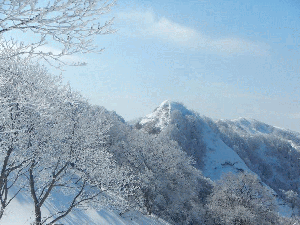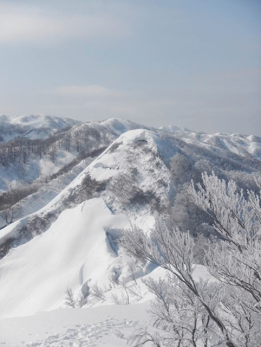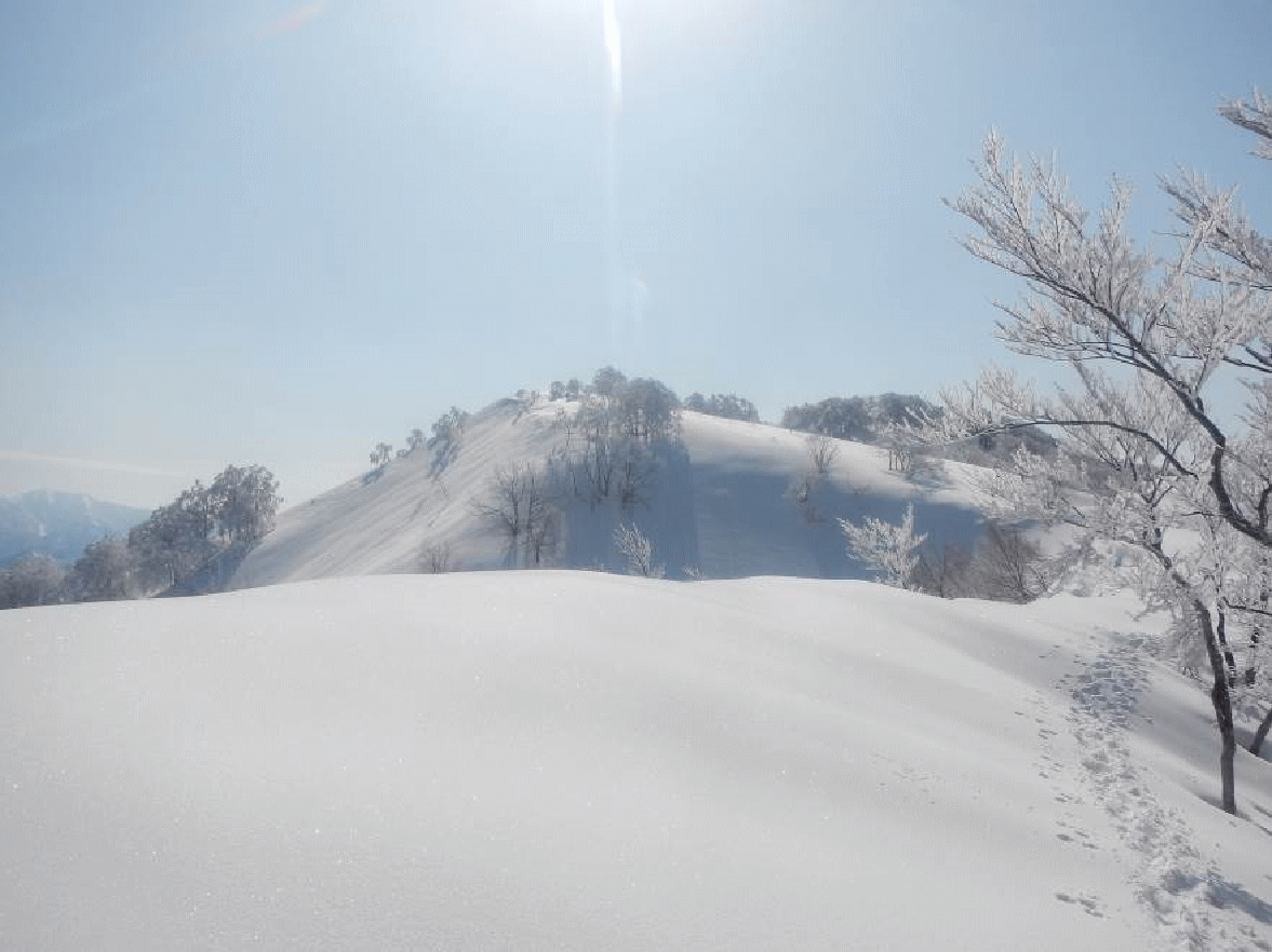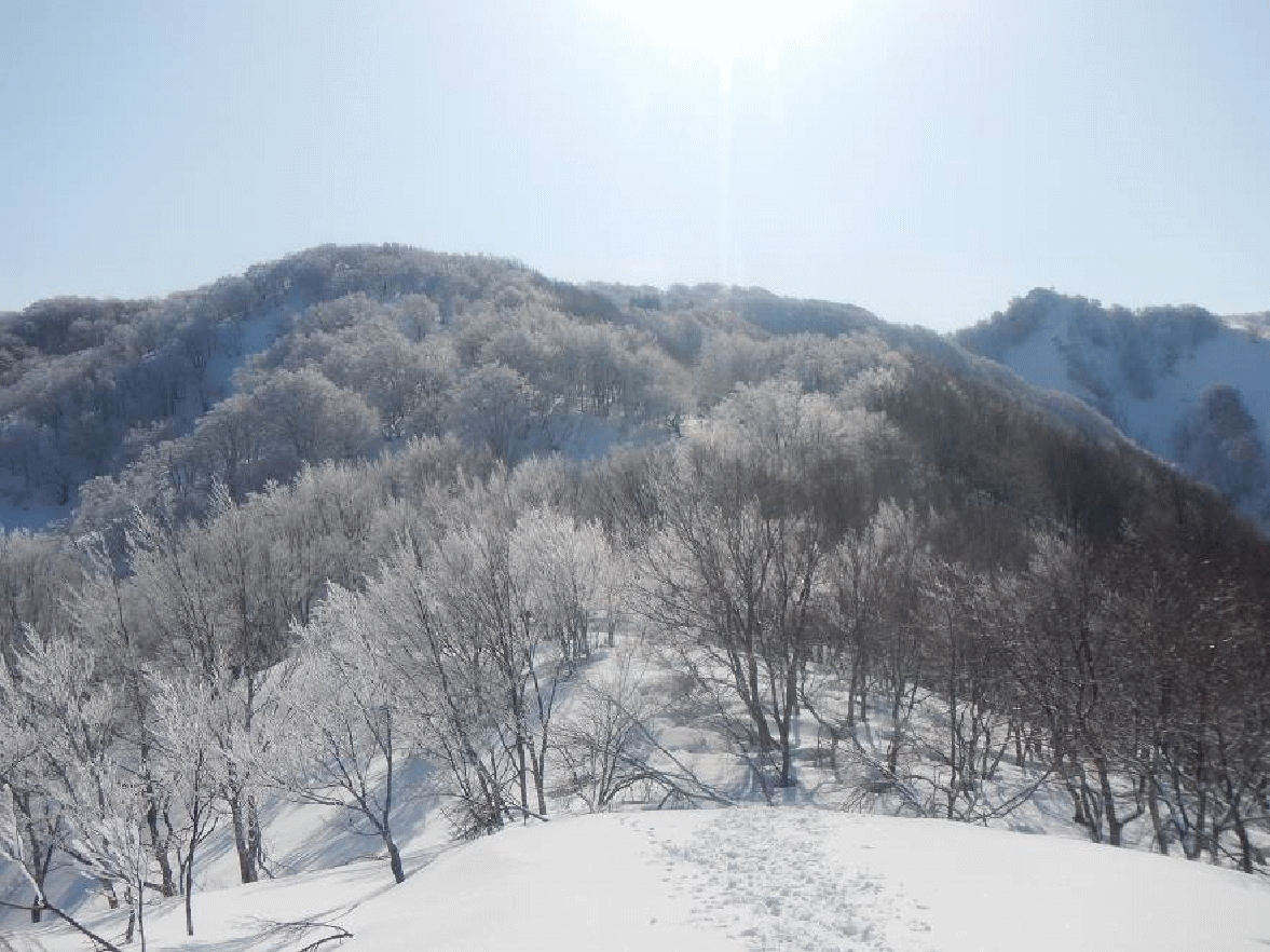 金鉢山への尾根取付は先端からではなく、トレースは林道が沢を渡る手前で急斜面を突き上げていた。尾根に乗れば明瞭な尾根歩きとなる。ブナ林となるあたりから安定して雪の上を歩くようになり、明瞭なトレース跡を行く。スノーシューは要らないくらい。気温が上がっていないのか、陽は差しているのに雪面は固く、霧氷も落ちてこない。