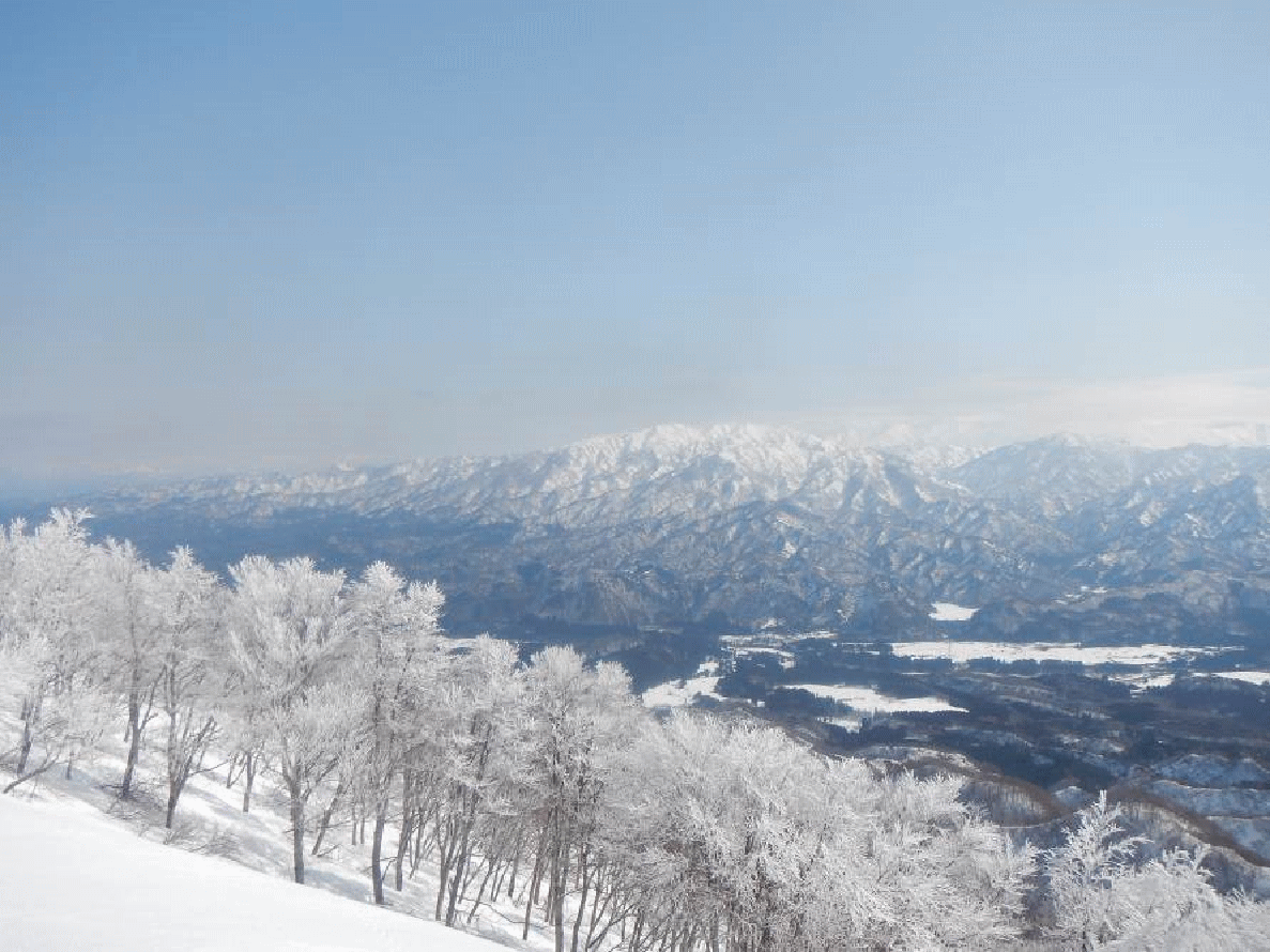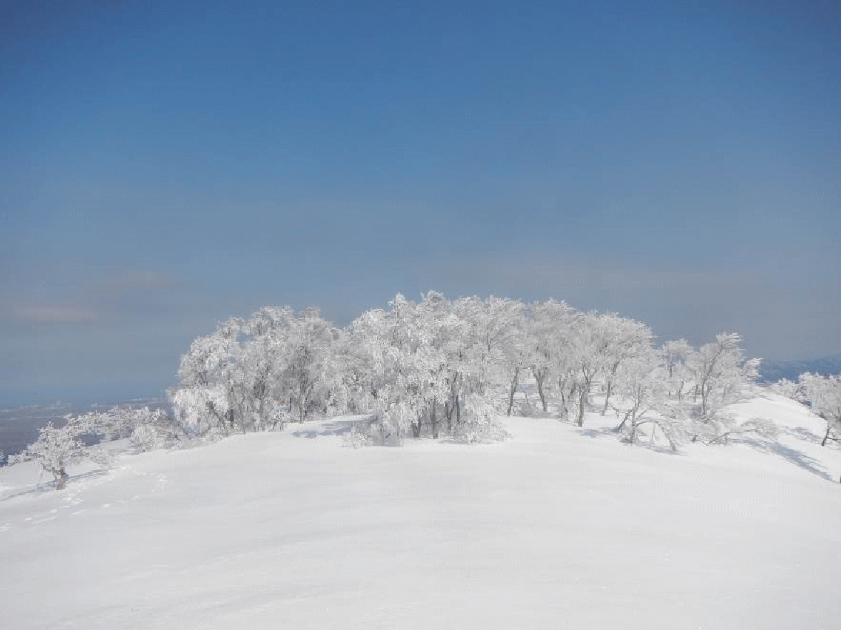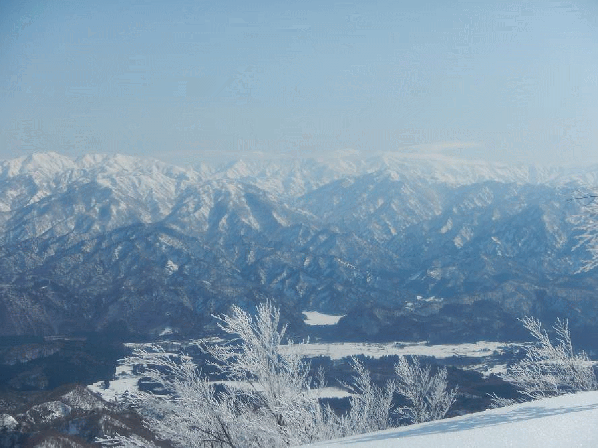 山頂への稜線に上がるとより白く輝く飯豊連峰が目の前に現れた。緩やかな雪原を登れば金鉢山だった。一時期、積雪期によく登った金鉢山。まったりとした山頂に広がる雪原、白く輝く木々たち、そして飯豊の大展望は変わっていない。私にとっては折居山というほうがしっくりくる、懐かしい山頂だった。金鉾山を見ると東面は雪崩れており、反対側はモッコリと?スパッと??切れていて、状態はどうも悪そう。取り付いていた先行パーティーも戻りかけていた。