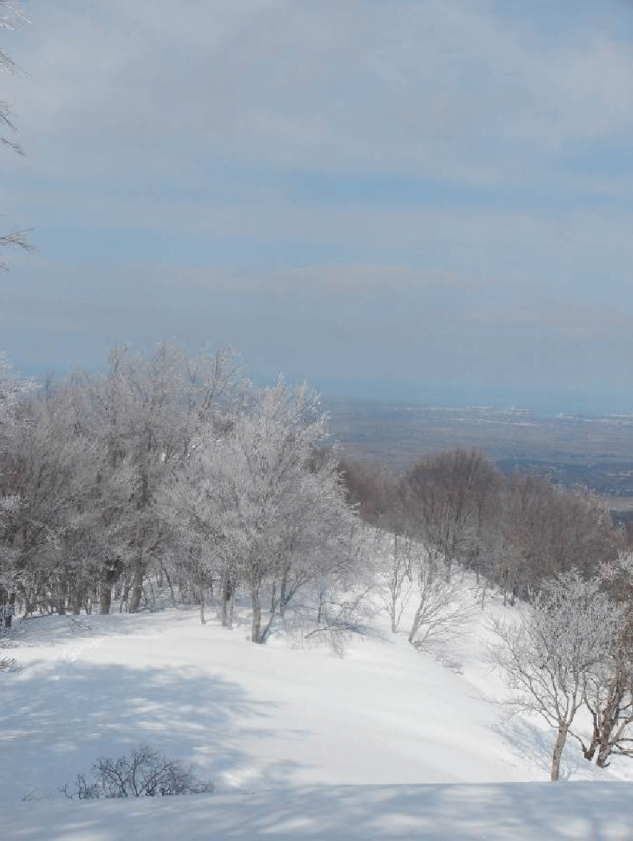 お昼頃から天気も下り坂になるという予報だったので、早めに山頂を後にする。下りは尾根の先端までたどって下りようとした。最後にこのルートを登ったのが10年くらい前。その時はまだ伐採地だったはず。が、木は育ち、立派なヤブとなっていた。雪の付き具合も中途半端な上にザックに付けたスノーシューとピッケルがもろ邪魔をし、歩きにくいこと。脛に大きな青アザを作って林道に着いた。