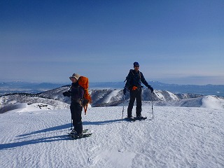 360度の大パノラマで東北の山々が私たちを出迎えてくれ、大感激でした。「やっほ〜」。真っ青な空に真っ白
