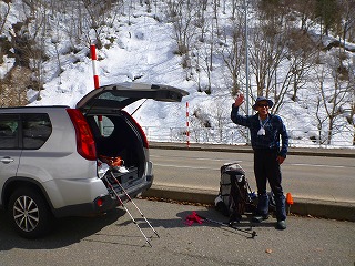 駐車場には車が1台。支度をしていると軽トラからおじさんが。地元のエーデルワイス山の会(でしたでしょうか?)の方で、新潟県の豊栄山岳会とも交流があるとの話をされ、アイゼンを取りに行って来たとのことでした。今日は日帰りで飯森山までピストンされるとのことでした。
