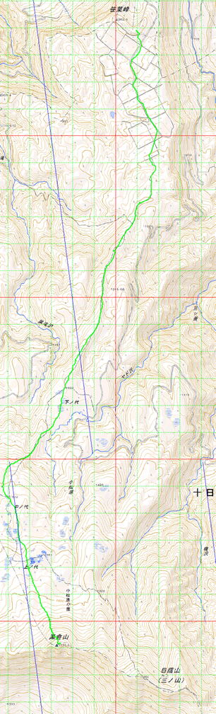 【実録時間】 ニュー・グリーンピア津南ゲレンデトップ(標高965m)9:12 − 畑の終わり(標高1085m)9:51 − 下ノ代(1339m標高点) 11:11 − 中ノ代(1512m標高点付近) 11:52 − 上ノ代(1575m付近) 12:12 − 山頂1777m