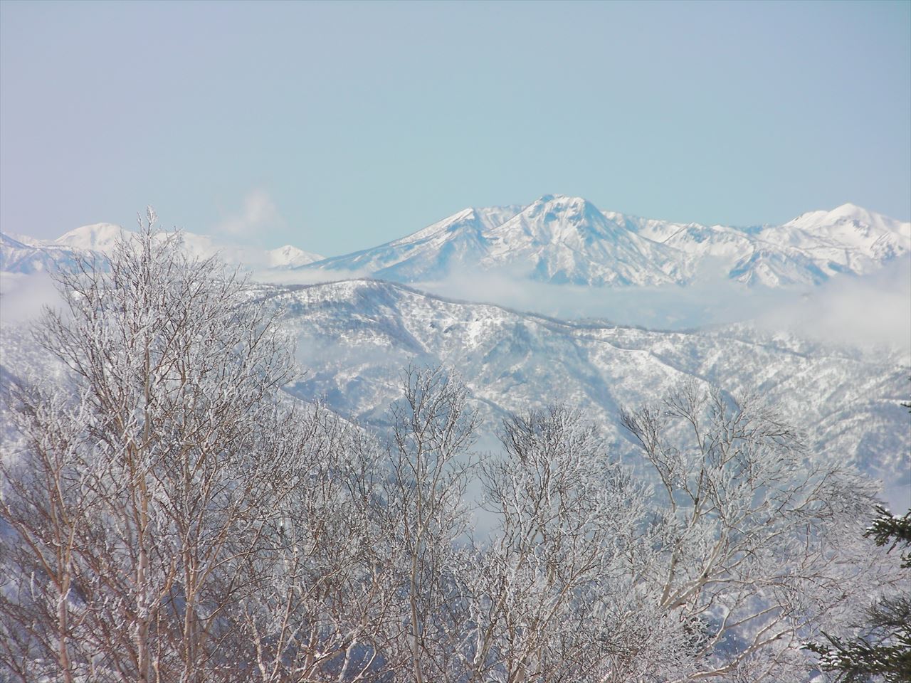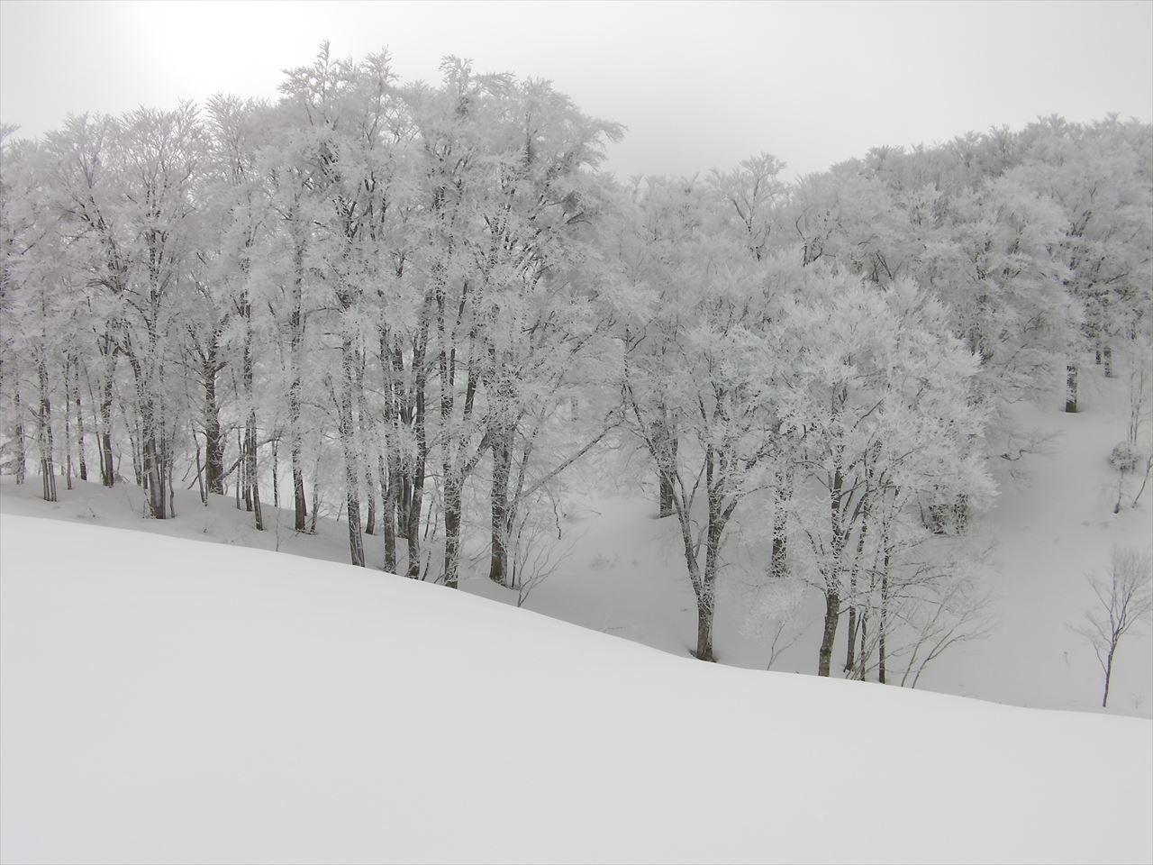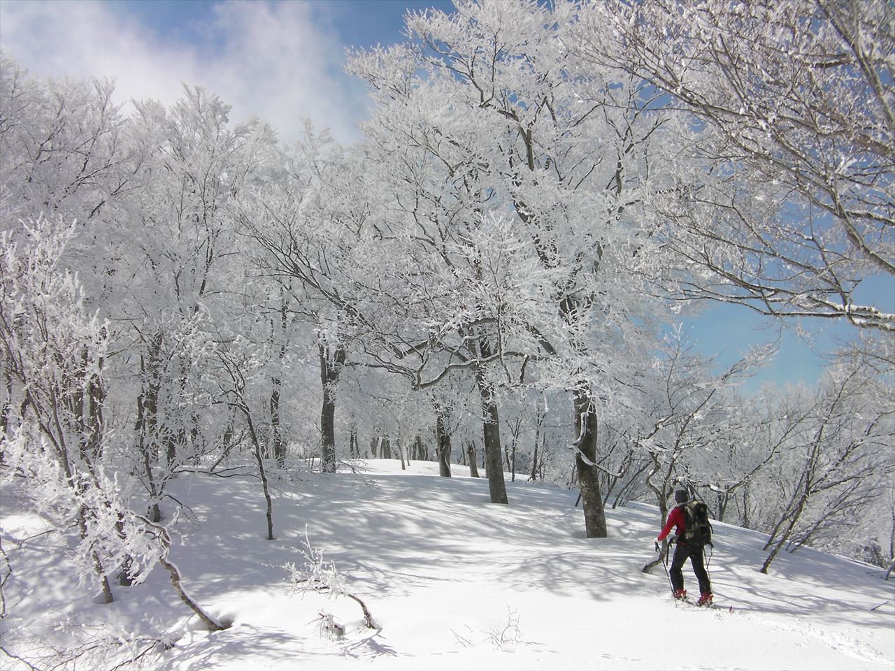 まだまだ遠いが,広がり始めた青空にブナの霧氷で癒される.