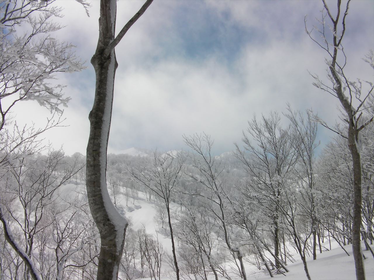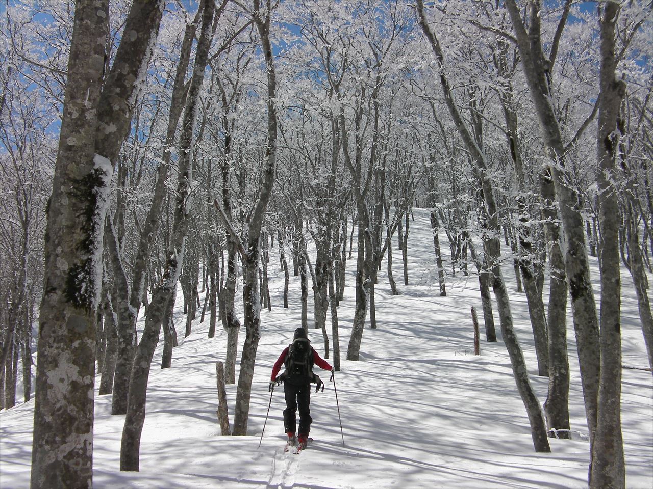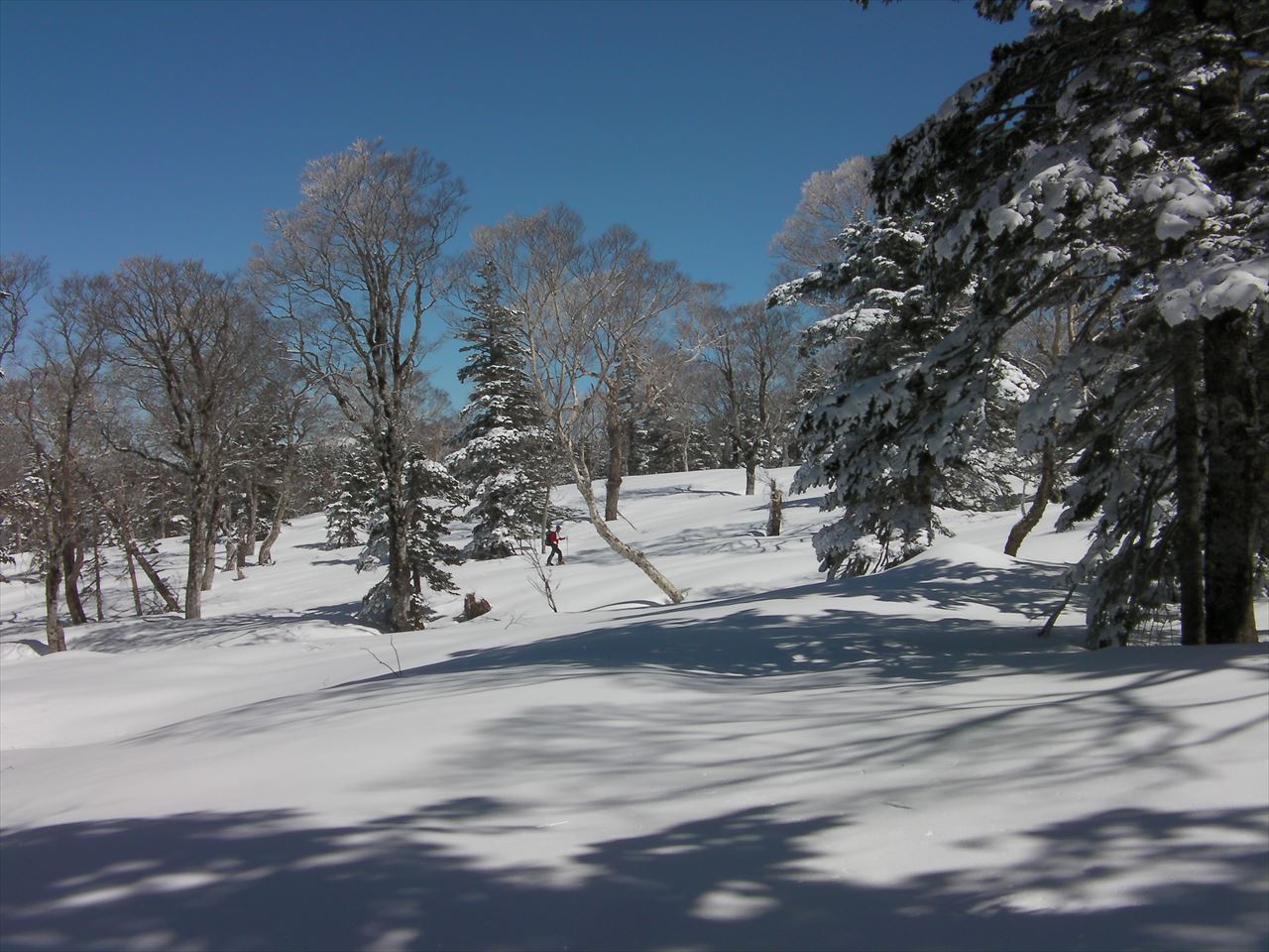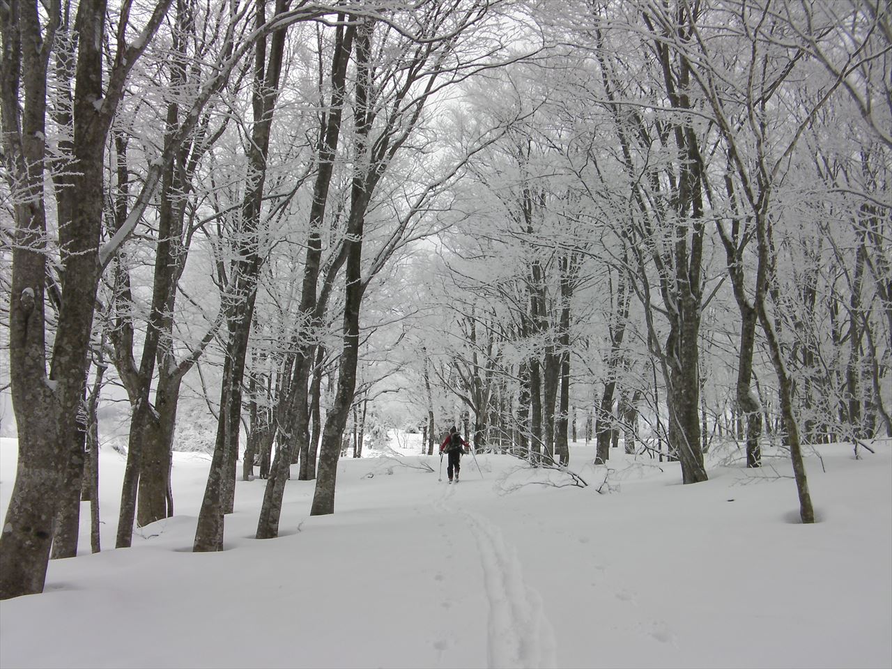 湿原と湿原の間のブナ林の斜面は固くしまった雪面に粉っぽい雪が載っていて思いのほか快適な滑りが楽しめる.