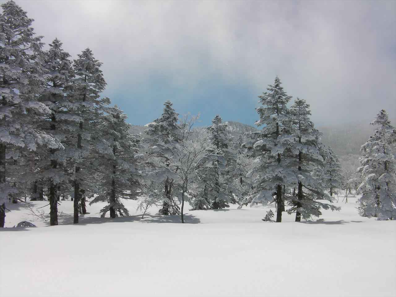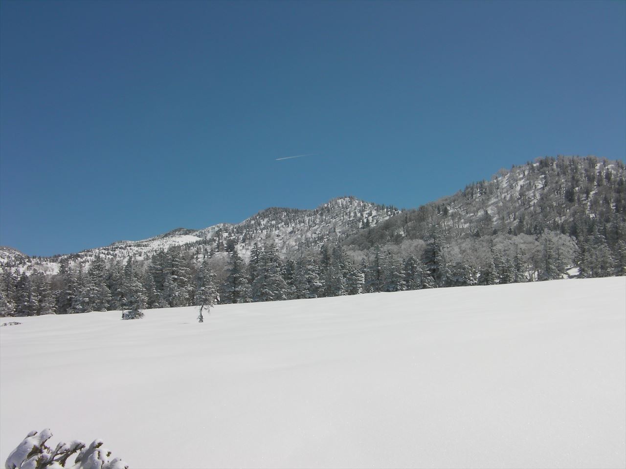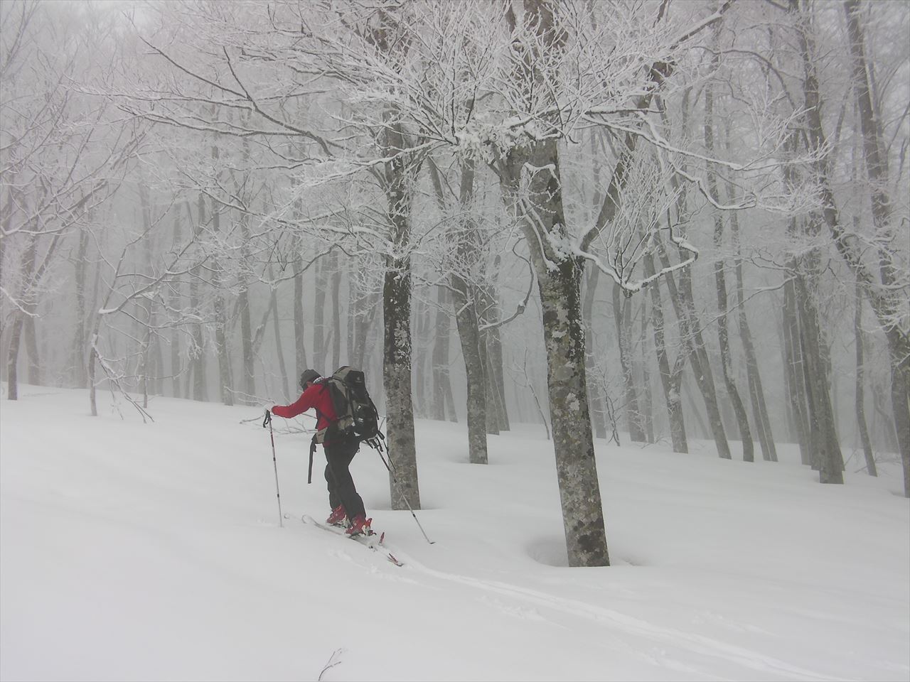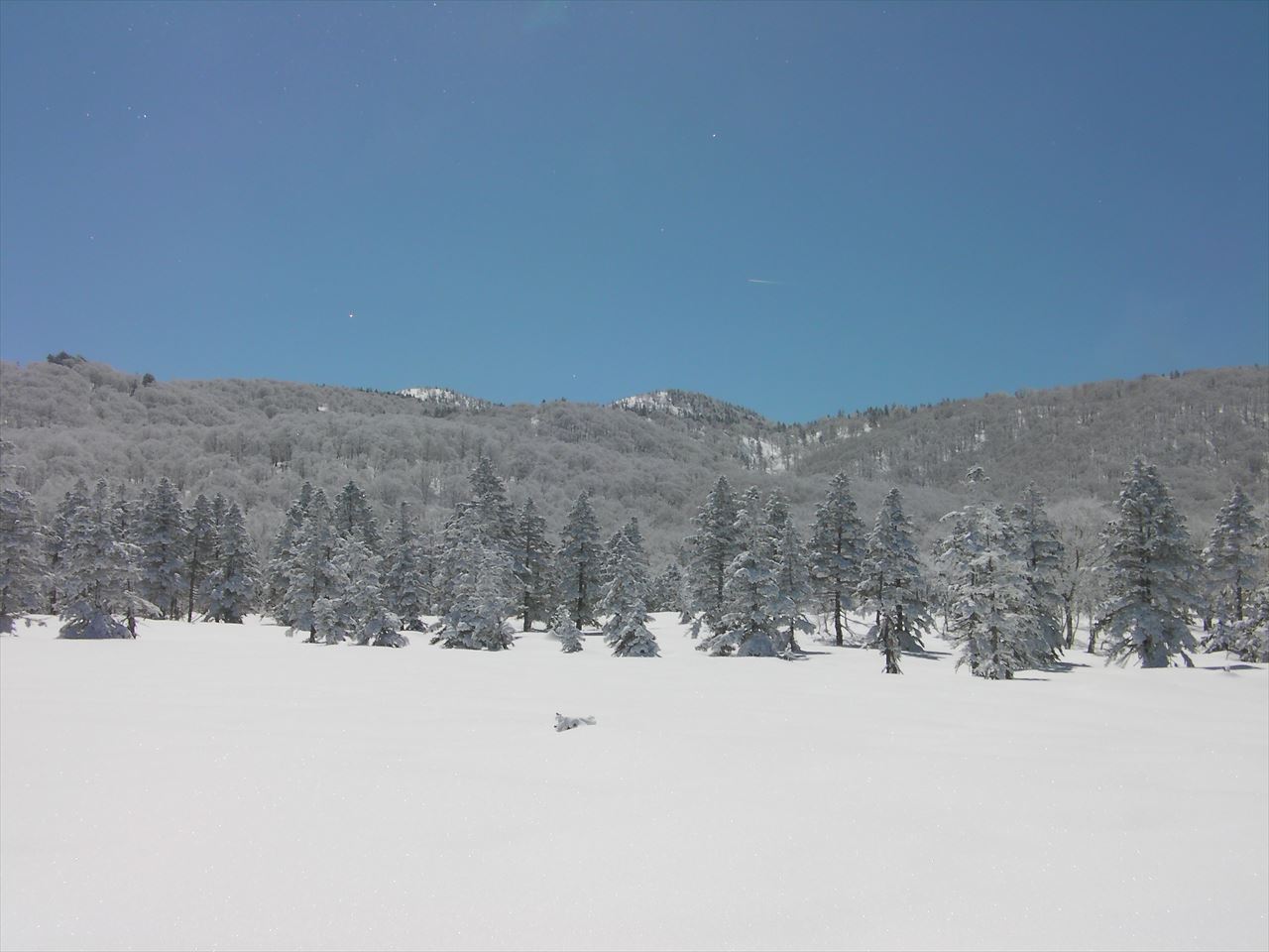 湿原と湿原の間のブナ林の斜面は固くしまった雪面に粉っぽい雪が載っていて思いのほか快適な滑りが楽しめる.