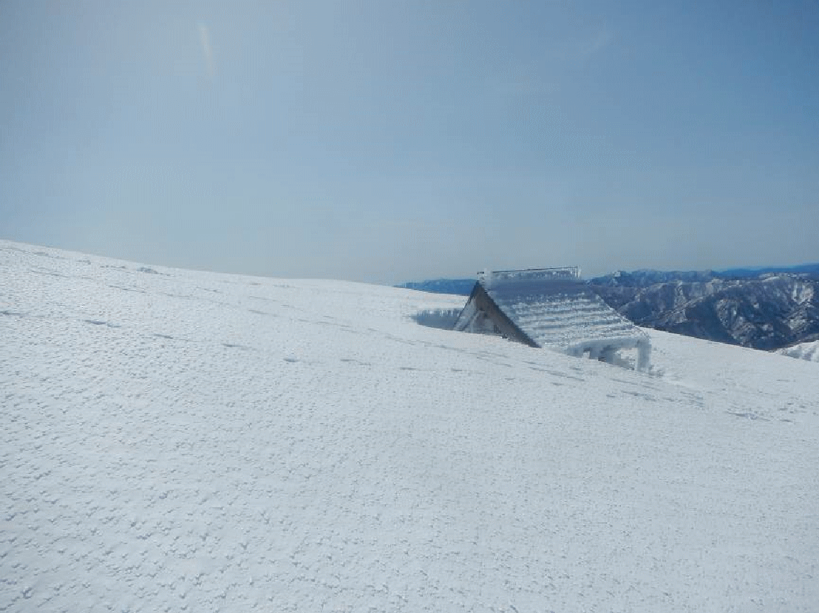 下りは雪が腐ってきていたので、少し安心。シャクナゲ平を越えるとトレース跡も減り、小荒島岳ではまた静かな山頂となった。荒島岳の山容とは違い、モッコリとした丸い山頂。標高も400メートルほど下がるので、風も優しく感じられる。どことなく安らぐ山頂でもあった。