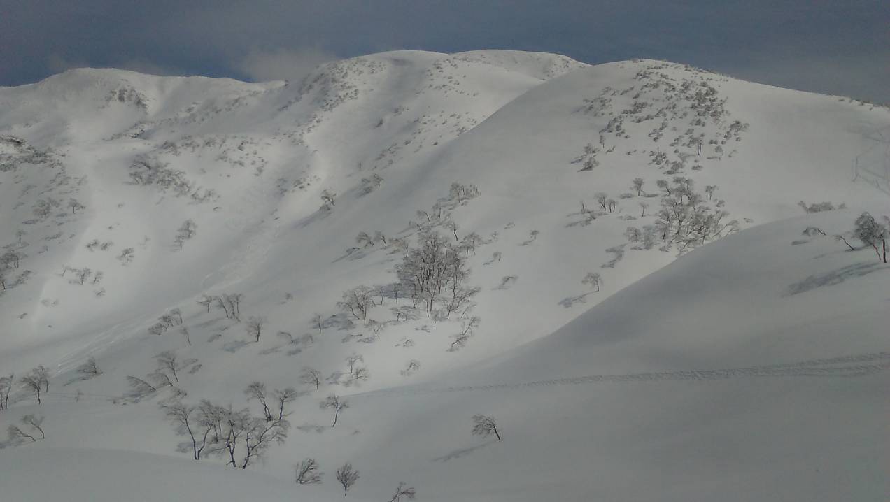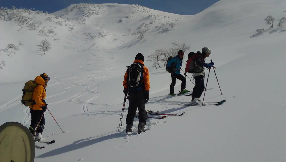 10年以上前に何度か通ったわさび沢、久しぶりに行ってきた。雪の少なくなった南俣からスキーを担ぎ出発。標高500m付近でスキーを履きシール登行、昨日の雨はこのあたりでは雪で、湿った雪に薄っすらと覆れていた。独標の積雪は4m、いまの時期としてはかなり多い。新雪が表面をフラットにしてくれた為、順調なシール登行で頂上へは早く着いた。今日のスキー滑降は頂上1420mからわさび沢出合450mまで標高差約1000mの大滑降となるしかもじゃまなブッシュはほとんど無い。核心部のわさび沢だけでも標高差約500mの中〜急斜面がつづく。本流の大張沢との出合で滑る石に手間取ったが対岸に渡渉するとまもなくスキー場に着く。新潟市からわずか30〜40kmの至近距離にあるスケールの大きい山スキールート、二王子岳の山スキーの魅力を改めて感じた。