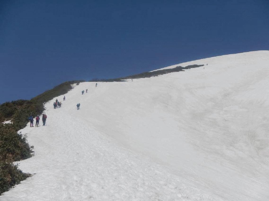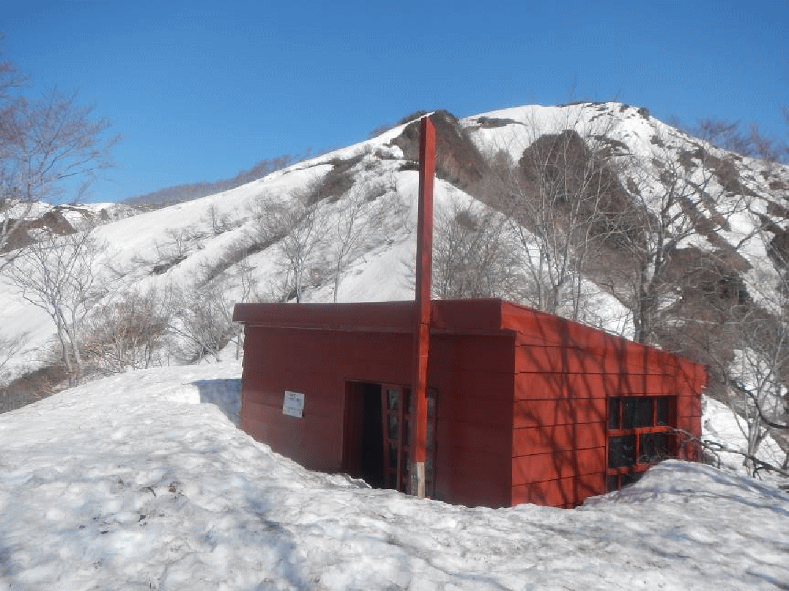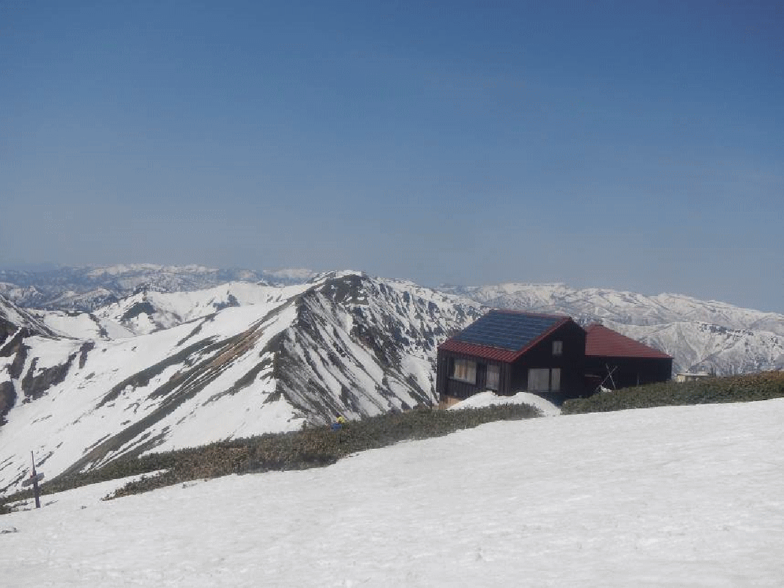 小屋からは本峰に向けては広い雪斜面となり、傾斜も増してくる。「春山は朝が勝負だ!」ということを聞いたことがある。気温上昇とともに雪は軟らかくなり歩きづらくなる。汗も噴き出す。やっと傾斜が緩んだと思ったら、肩の小屋だった。