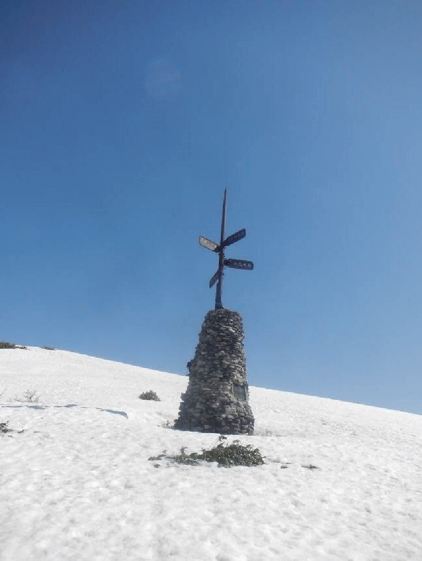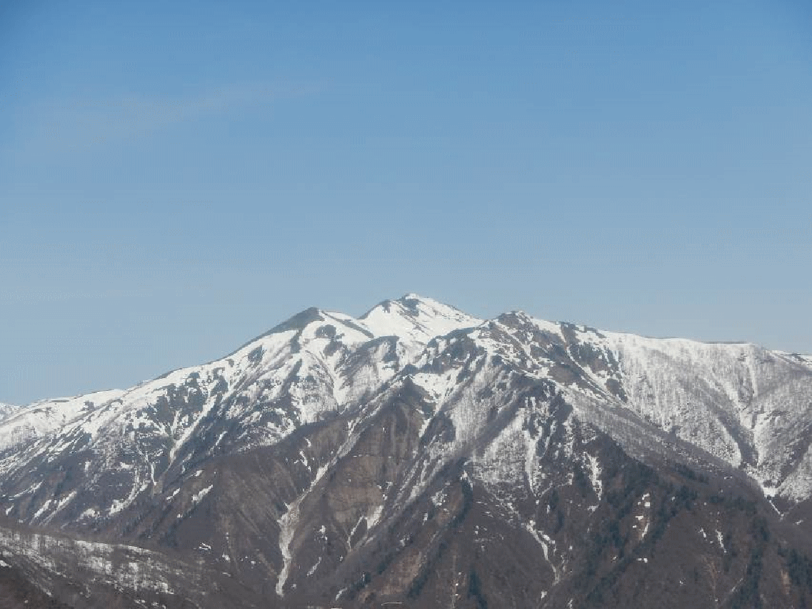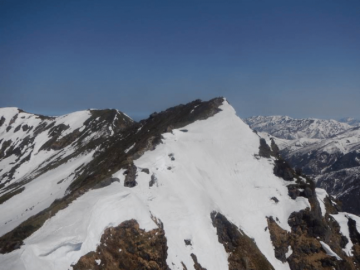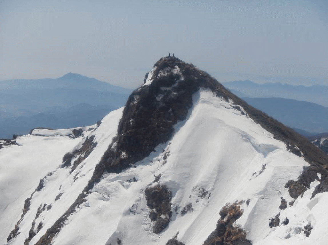 小屋からは本峰に向けては広い雪斜面となり、傾斜も増してくる。「春山は朝が勝負だ!」ということを聞いたことがある。気温上昇とともに雪は軟らかくなり歩きづらくなる。汗も噴き出す。やっと傾斜が緩んだと思ったら、肩の小屋だった。