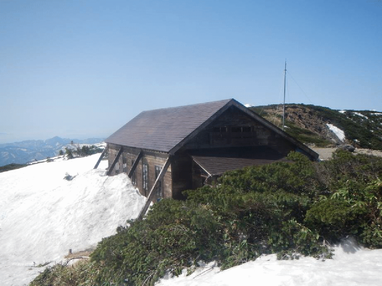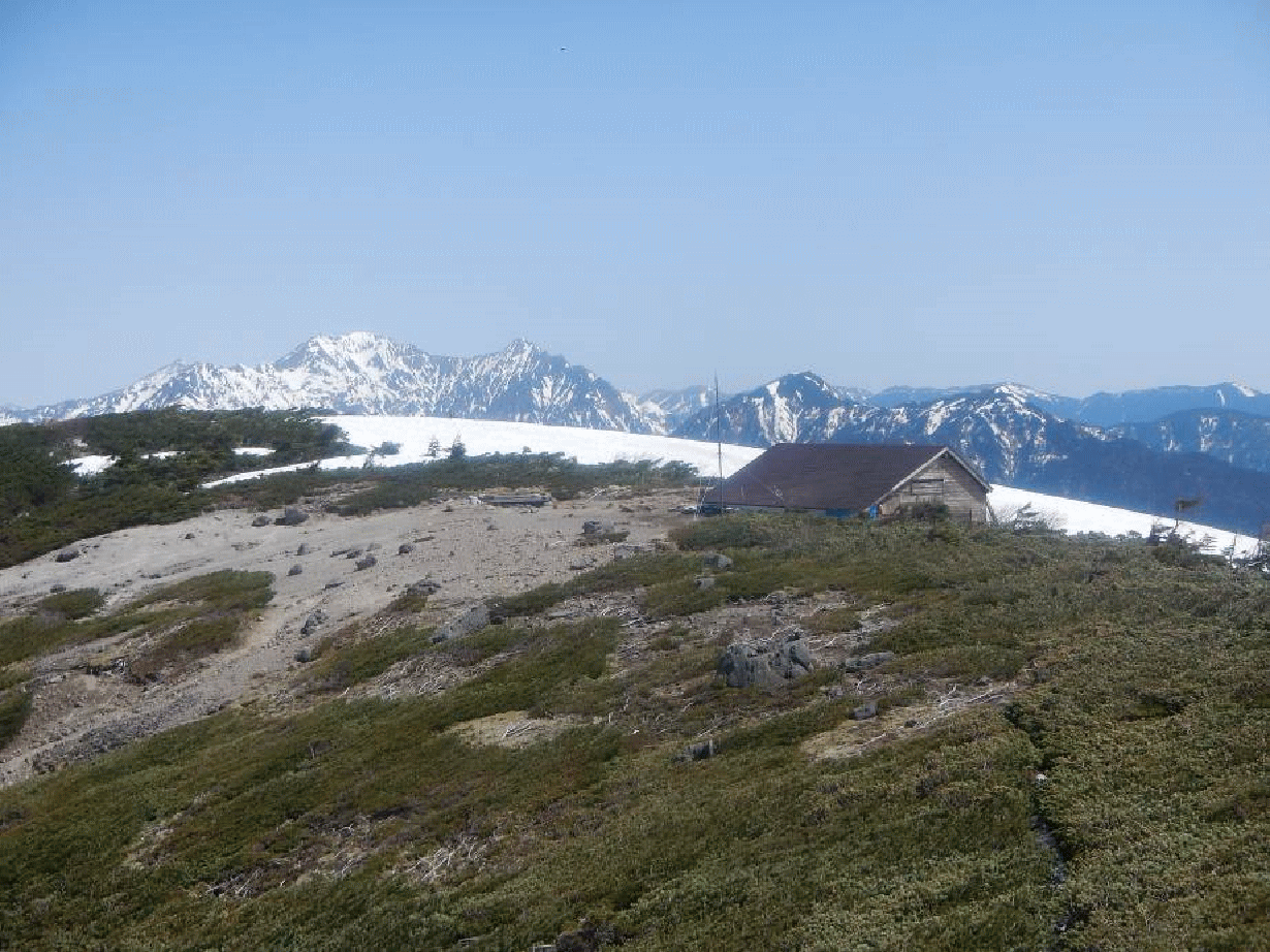山頂からの展望は素晴らしかった。乗鞍岳はすぐ目の前に大きくそびえ立っている。奥穂から前穂の吊尾根、奥穂の奥に槍ヶ岳、笠ヶ岳から抜戸岳の尾根、黒部源流の山々が連なって見える。北アルプス南部の展望台の山だった。山頂にある立派な避難小屋は地元の方々が管理されているとのこと。山頂で会った人が大分前は営業小屋だったようだ、と教えてくれた。十石峠小屋という名前でもあり、昔は峠越えで使われていた山、ピークなのかもしれない。顕著な山々に囲まれ、どこか忘れられてしまったような静かな山。その山頂からは大展望が広がり、魅力ある山だった。無雪期はどうなのだろう。再訪してみたい。