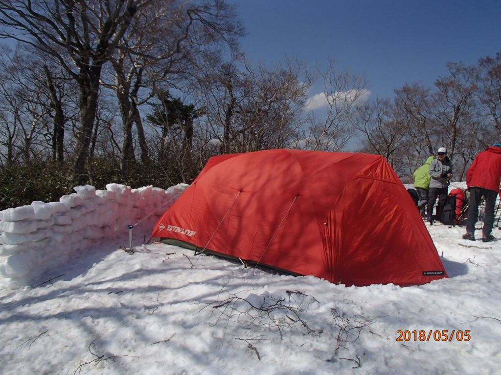 午後1時を過ぎたばかりで少し早いがテントの設営に取りかかる。一級テント設営士のA氏の厳しい指導のもと、疲れた体にむち打って雪面をならし、ブロックを積み上げる。