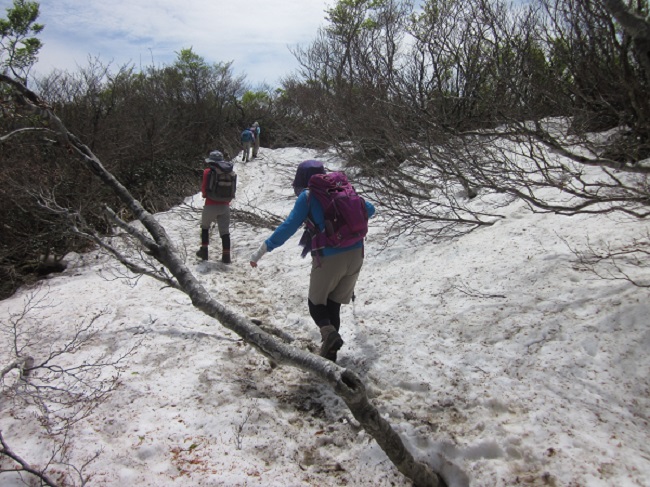 大蔵山から菅名岳の間、雪がまだ残っていて、木の枝が邪魔して歩き悪かったです。