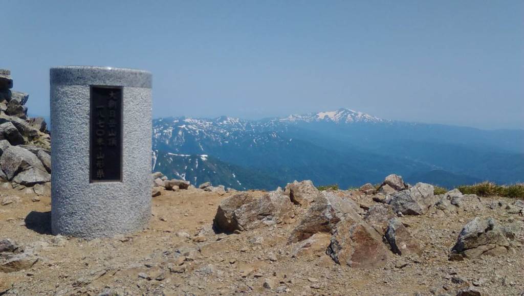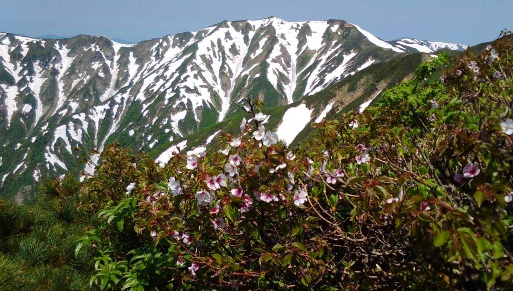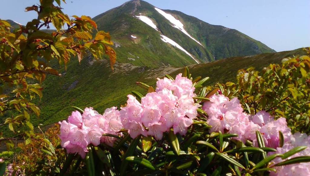 ミネザクラ バックは西朝日岳 大朝日岳頂上近く