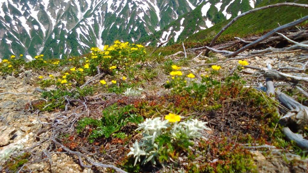 キジムシロとウスユキソウ 平岩山と大朝日のコル