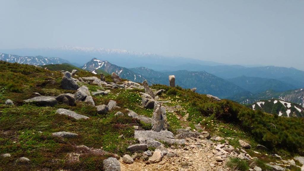 祝瓶山の頭と奥に雲のような飯豊連峰 平岩山へ下山途中