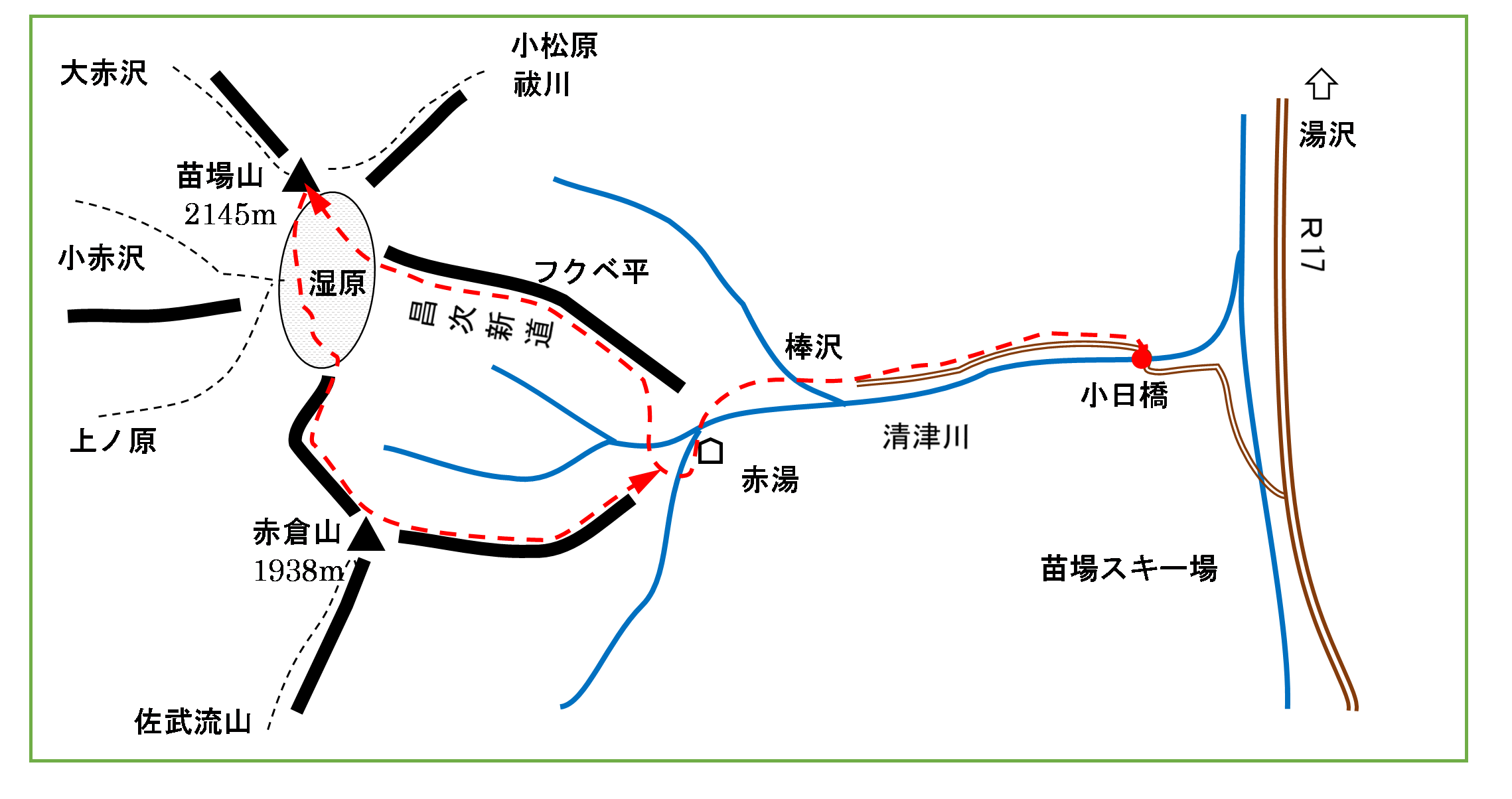 【時間記録】 小日橋6:40 – 棒沢7:20 – 赤湯8:20 – フクベ平10:05 – 苗場山頂12:15~12:45 - 赤倉山14:25 – 赤湯16:00 – 棒沢16:45 -小日橋ゲート17:30