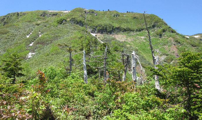 《昌次新道9合目 左上の残雪(横に細長く白い所)を越えると山頂湿原に出る》