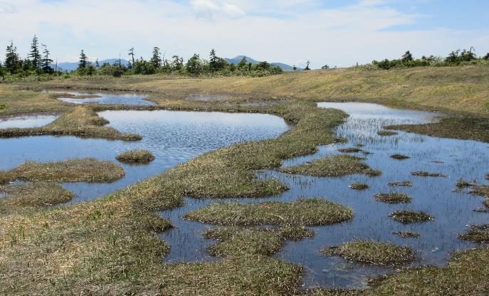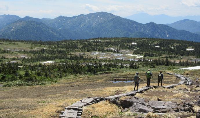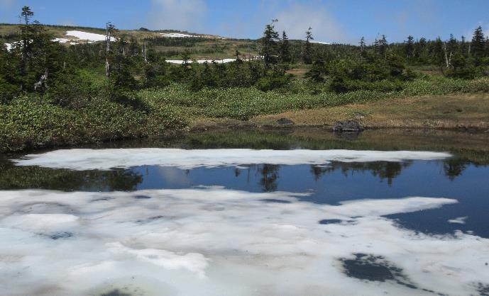 6月の山頂湿原は、まだ少し雪が残っていてようやく草の芽が伸び始めたところでした。まもなく緑の大地になります。