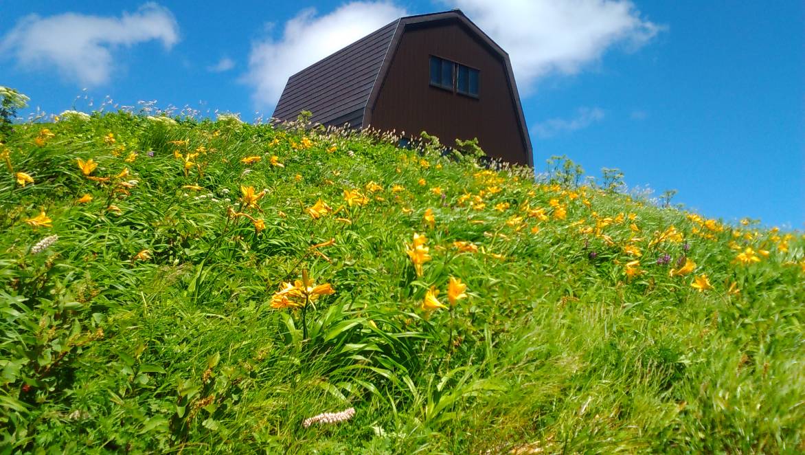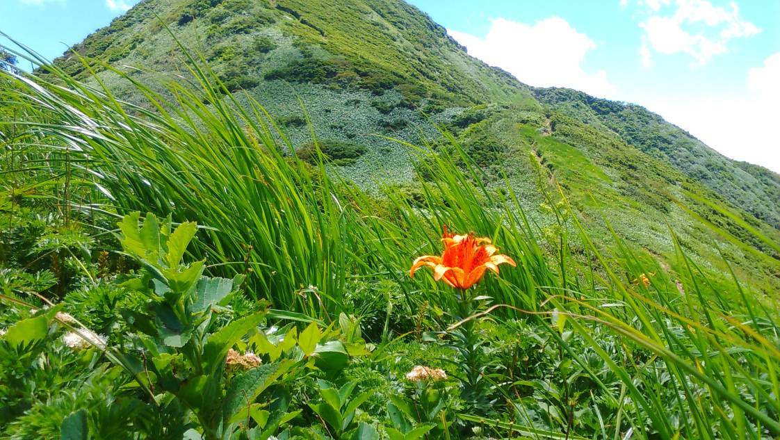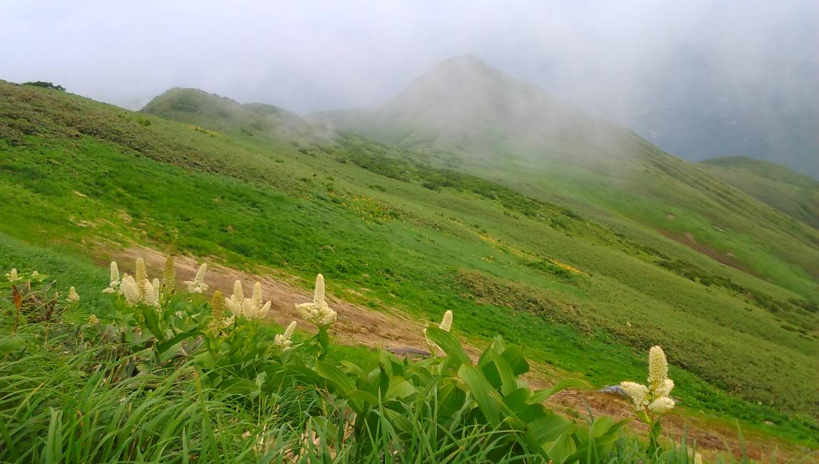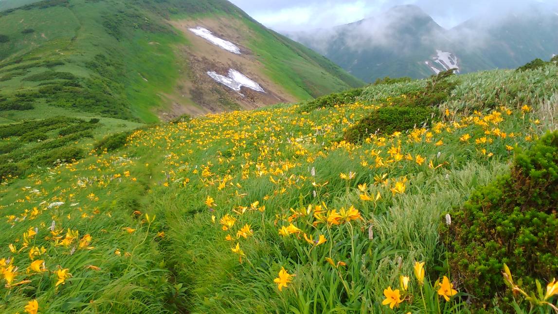 下山の朝、頼母木山から大石山への稜線でニッコウキスゲとガスのかかった鋒立峰