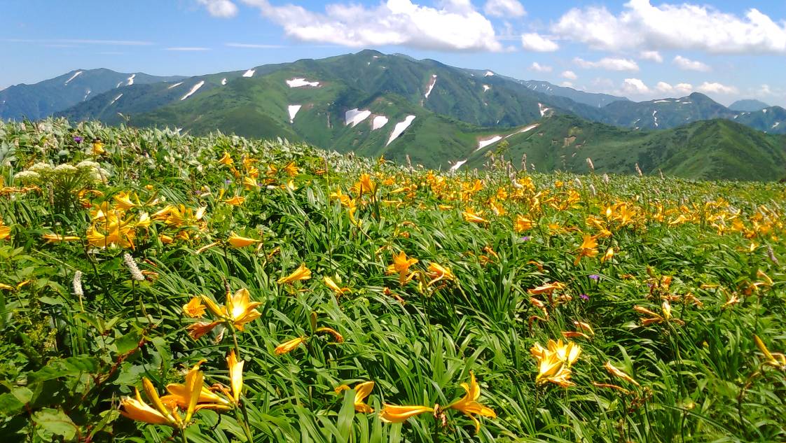 朳差小屋付近の感動的なニッコウキスゲ(今年は花の当たり年らしい)と頼母木山から地神山への稜線、左手には飯豊本山が見える