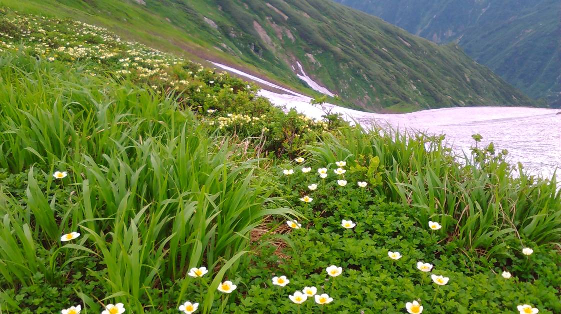 扇ノ地神の雪解けあとに咲くチングルマとアオノツガザクラ
