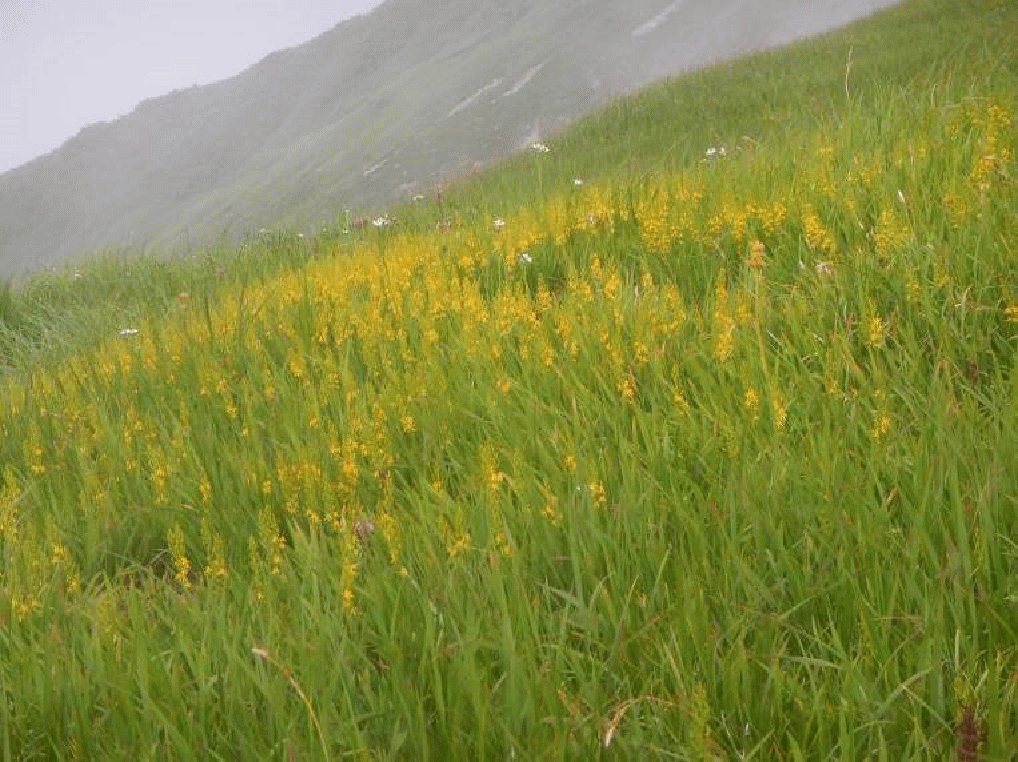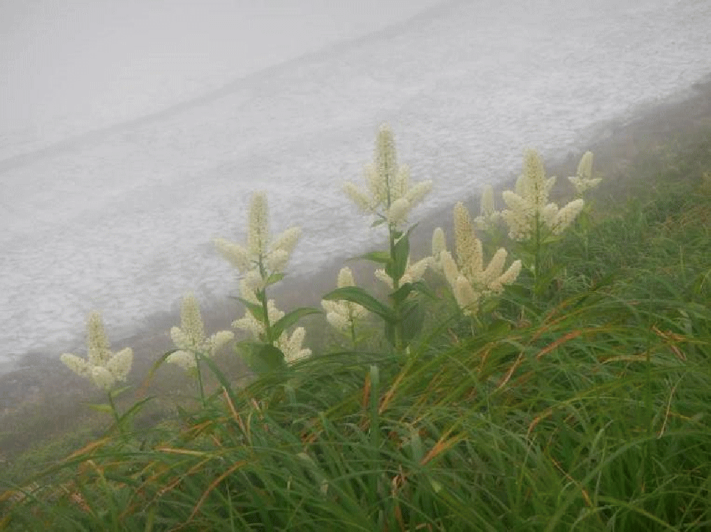 登り始めは暑かった。湯沢峰まではまだ青空が広がっていた。やはり暑い。半分バテて着いた梶川峰から上はガスの中に入り、縦走路では風も出てきた。尾根脇には残雪があり、雪渓を通る風は冷たく、寒い。何も見えず、ただ歩くのみとなった。咲き競う高山植物もガスの中ではぼやけて見えてしまい、美しさも半減してしまう。晴れていれば素晴らしいお花畑が広がっているのだろうに。ちょっぴり残念。