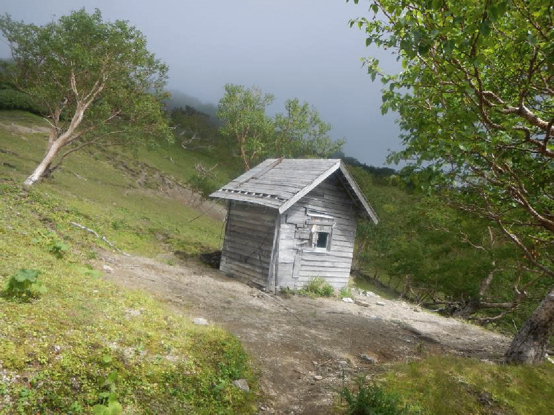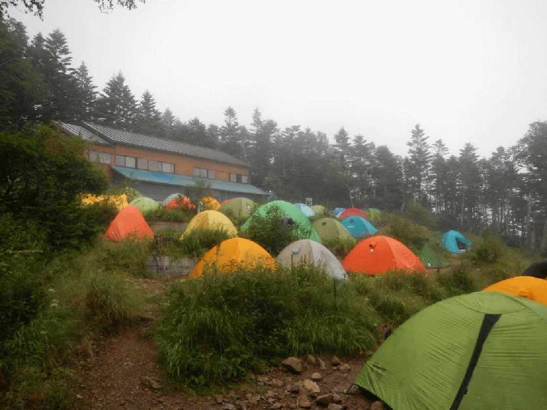 そのキャンプ場内に小屋があり、その小屋が開放されていたという奇跡的なことが起こった(と思っている)。半分が板張りの小上がり?になっていて、居住性抜群の空間。「神様は私たちを救ってくれたわ♡」と、大喜びでその小屋で一泊、温泉で朝風呂に入り帰路についた…という、荒天だった山ほど、山行としては忘れられないものとなる。