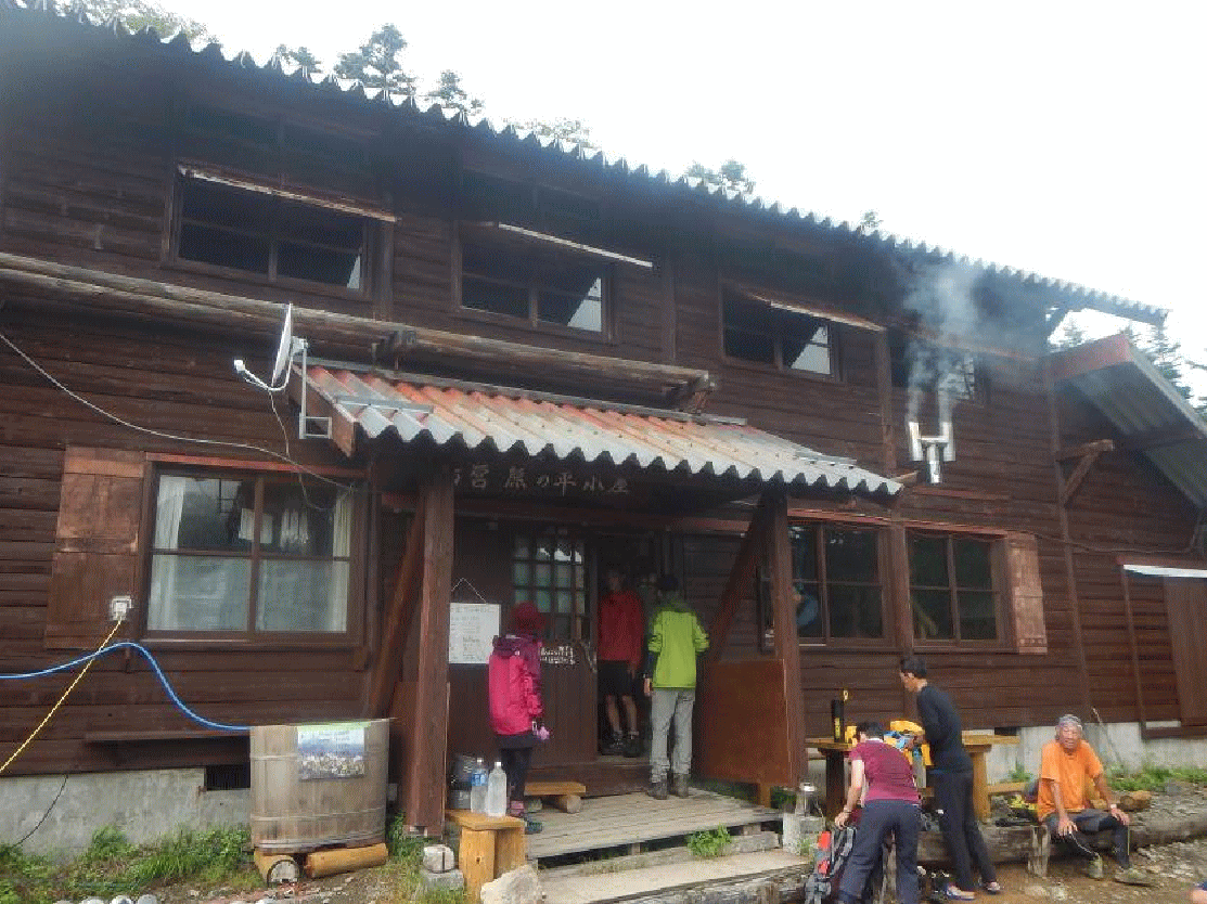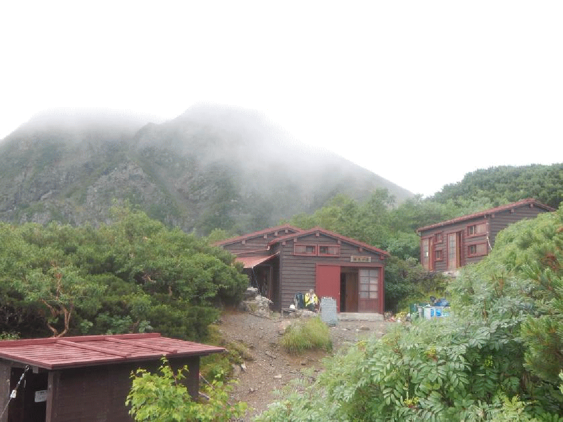 <2016年に新築オープンした塩見小屋。塩見岳はガスの中で見えず>