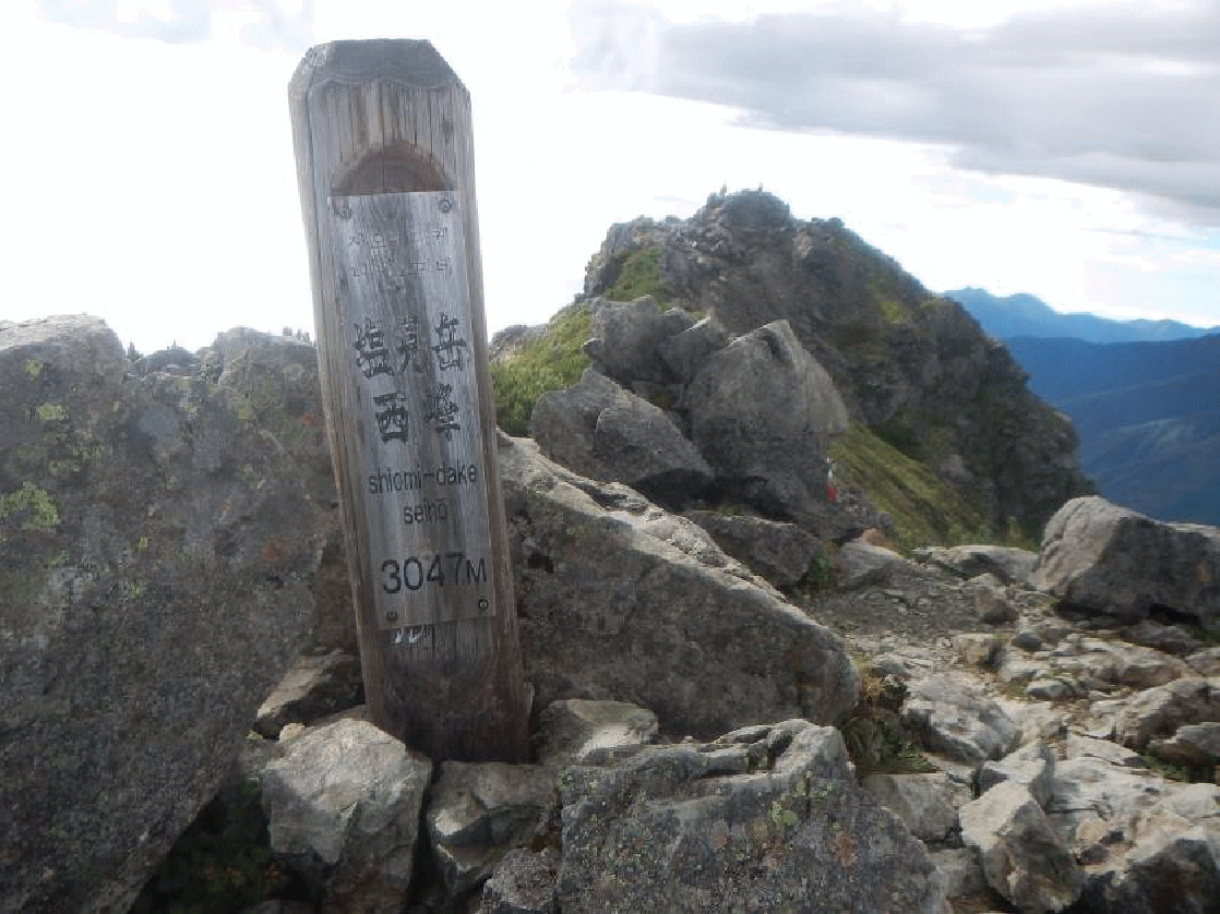 <塩見岳は双耳峰で標高3047m西峰に三角点がある。このあたりから青空が広がってきた>