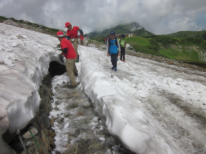 スタッフが万年雪を切り出して登山道を作ってました