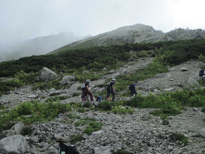 岩場やガレバが終わり、真砂岳へは穏やかな稜線となり、霧も晴れてきて歩く道もしっかりと見えてきました。