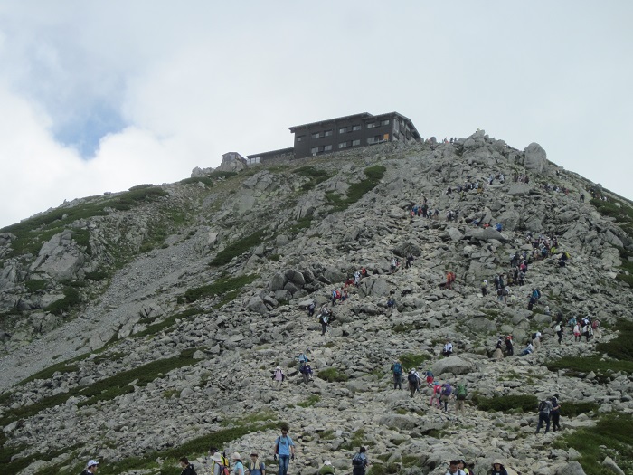 トイレ休憩(汚かった)。右に行けば浄土山、左の雄山へ登りる。お盆で沢山の人、人でアリの行列が出来ていた。