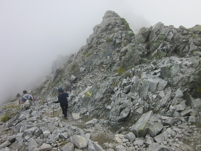 雄山から大汝山への入りは、急な下りの上、左がすぐ崖で切れている。さらに、足場が悪い上、霧で先が見え難い。