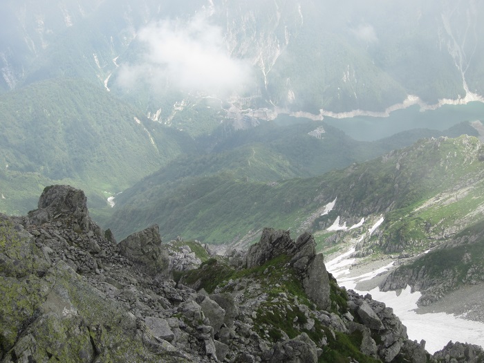 急に霧が晴れて、大汝山から黒部湖が見えた