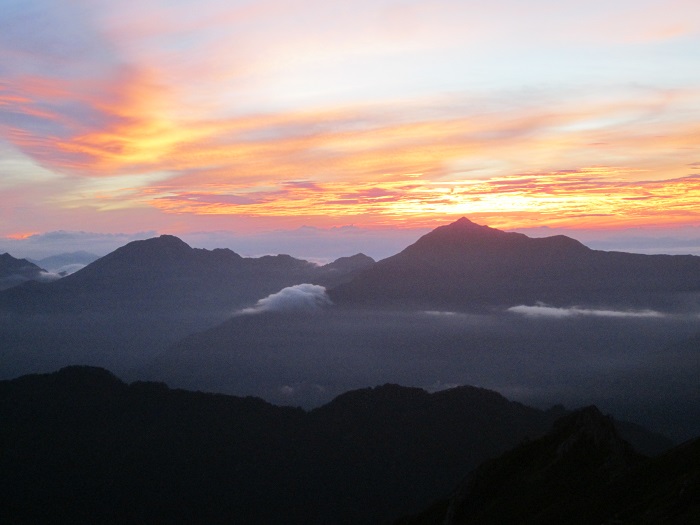15日・・朝焼けに鹿島槍ヶ岳が浮かび、富士山まで見えました。天気が良く、今日の山行に期待し出発しました。