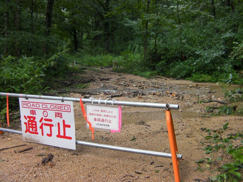 8月の豪雨で日暮沢手前の林道が抉られ,クマスベリ沢の先で通行止めとなっている.