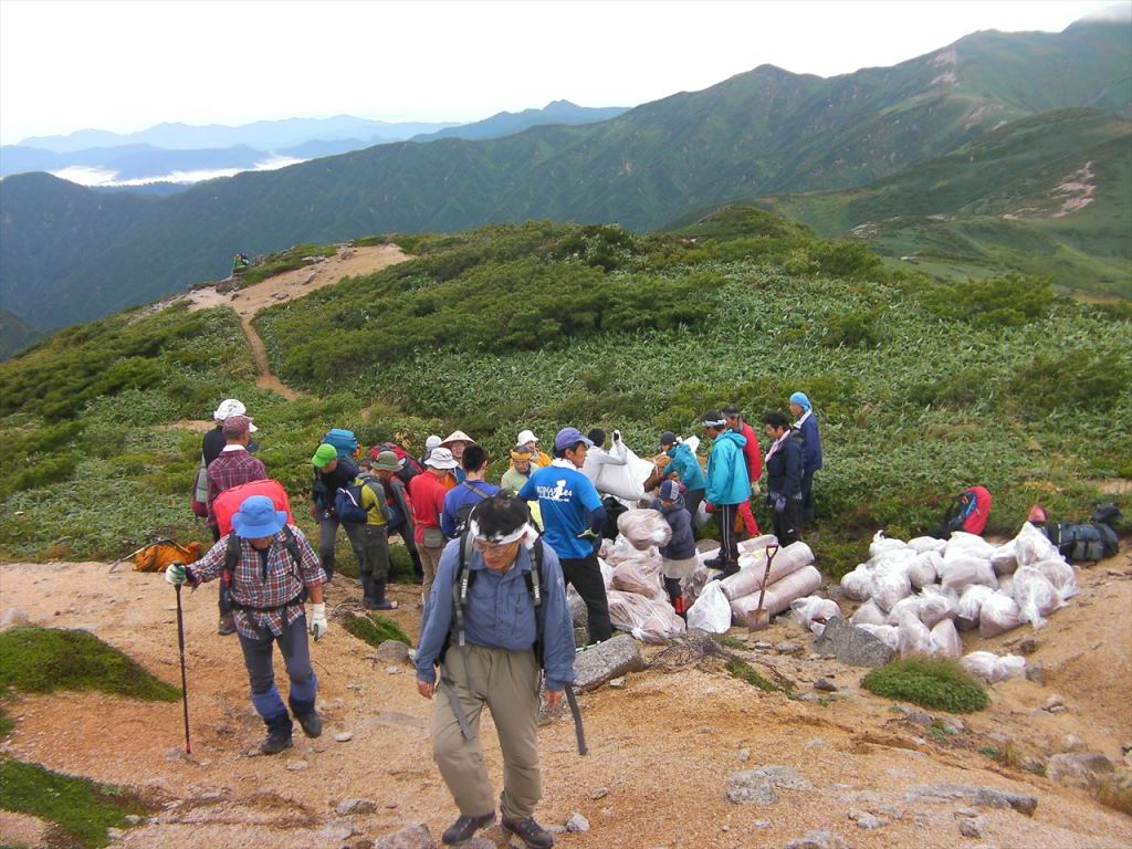 ザックを小屋に置き,力なく土嚢袋を持って三方境に登り返す.