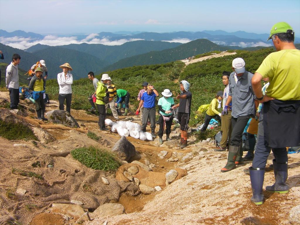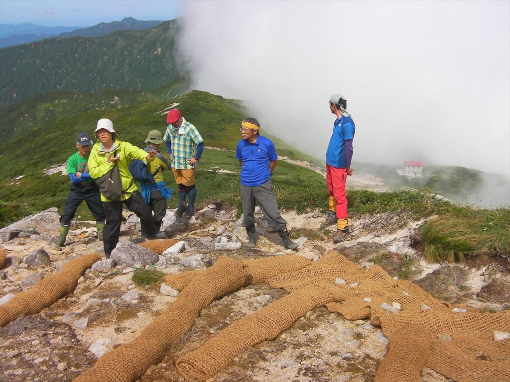 到着する前に,早い人はヤシネットなどの資材を抱えて三方境に登り返して運んでいる.