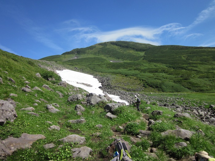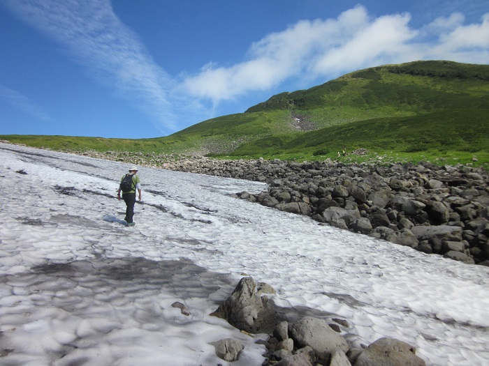 河原宿小屋跡で休憩(トイレ休憩)。ここから見上げると、雪渓と急坂の薊坂が見える。まだまだ先は長い。雪渓をトラバースし薊坂へ。急坂でペースが落ちてきて