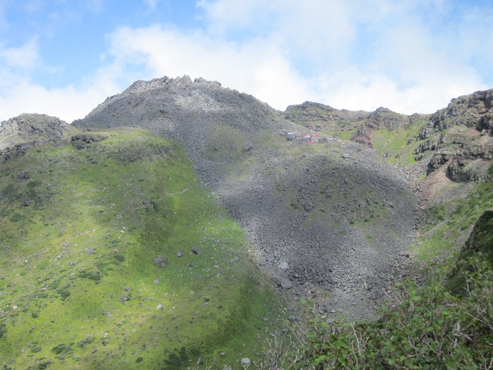 私とWさんは、伏拝岳から10分外輪を行ったところで、正面に鳥海山を眺めながら昼食をとりる。空は目まぐるしく、青空になったり曇ったり、最高の眺めでした。