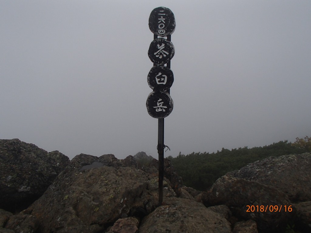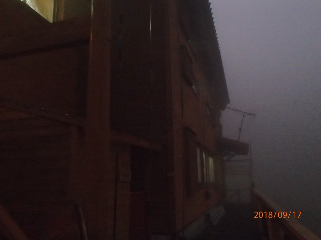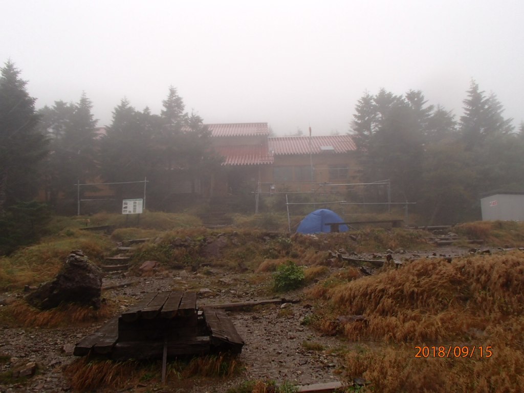 茶臼小屋の分岐まで下って、そこから約100mの登りで茶臼岳の山頂。ここもガスで展望はなし。見事な迄に展望には恵まれなかったが、辛かった分、達成感は半端ない。引き帰して茶臼小屋に入り、宿泊の受付をした。