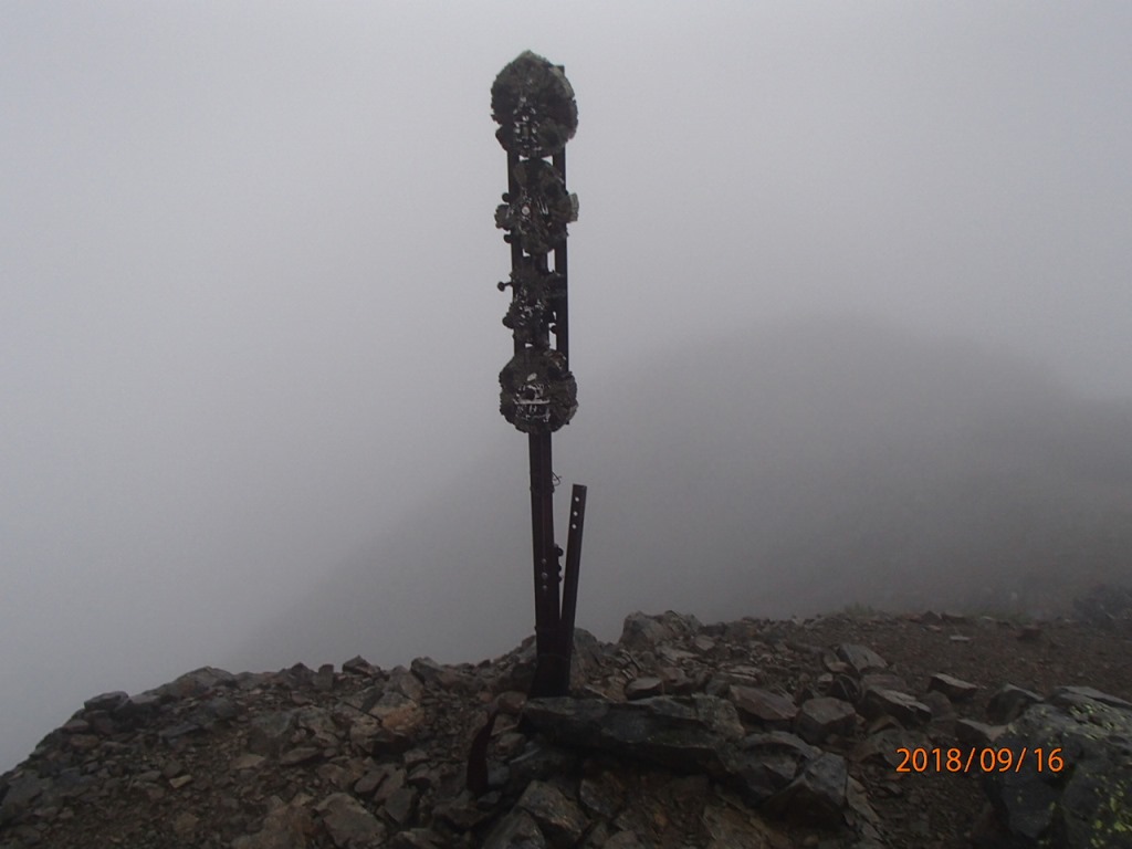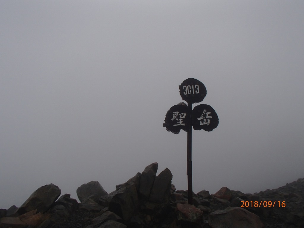 翌日は4時30分から朝食、5時25分頃には出発した。一晩中降っていた雨は、出発する時は霧雨状態となった。まだ良く乾いていない雨具を着て、ガスで展望の利かない尾根を登っていく。小屋から聖岳山頂へは標高差が約800mある。きつい登りを喘ぎながら、2時間30分位で念願の聖岳山頂に到着した。