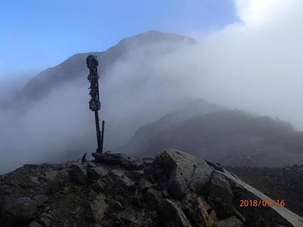 ガスで展望はなかったが、皆で登頂を喜んだ。風も強いので奥聖まで行くのはあきらめ、引き帰す。途中、小聖岳付近にさしかかった頃、一瞬ではあったが青空が覗き、聖岳が姿を現した。