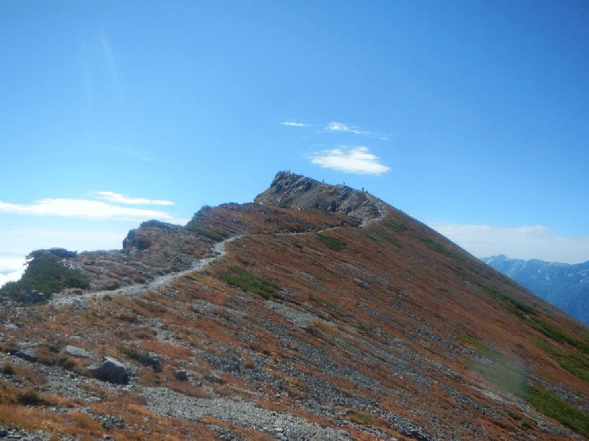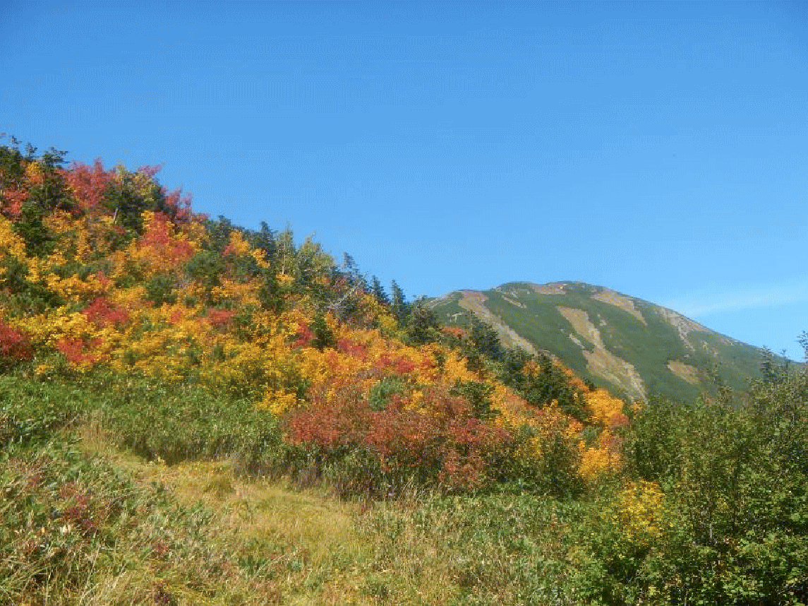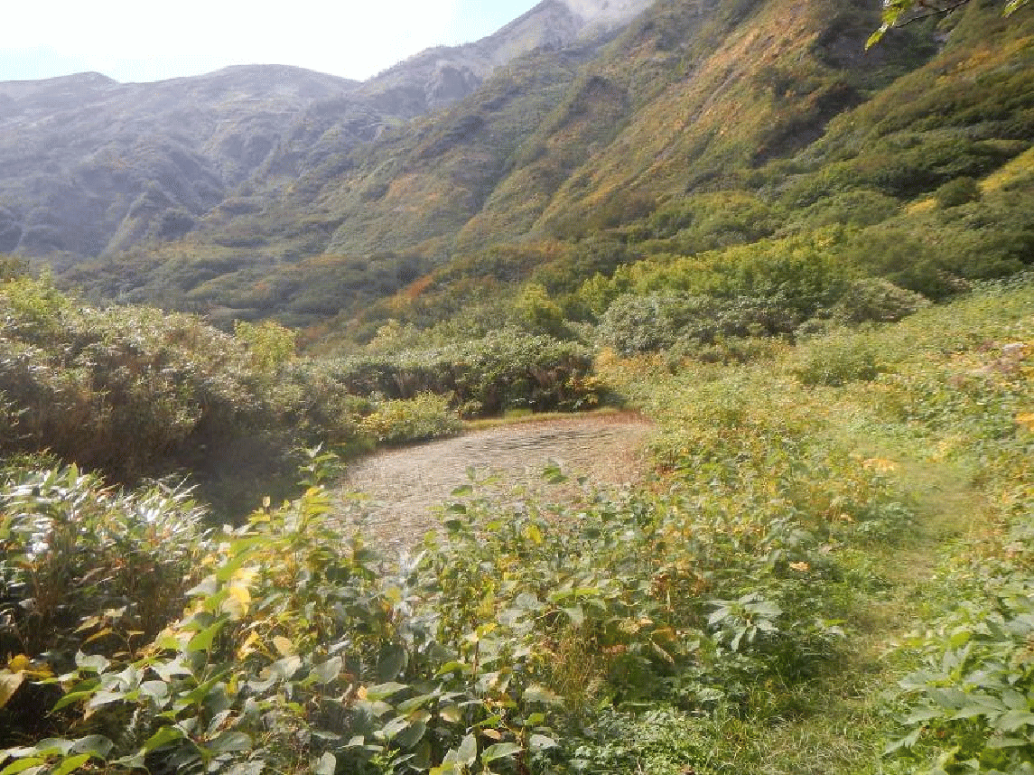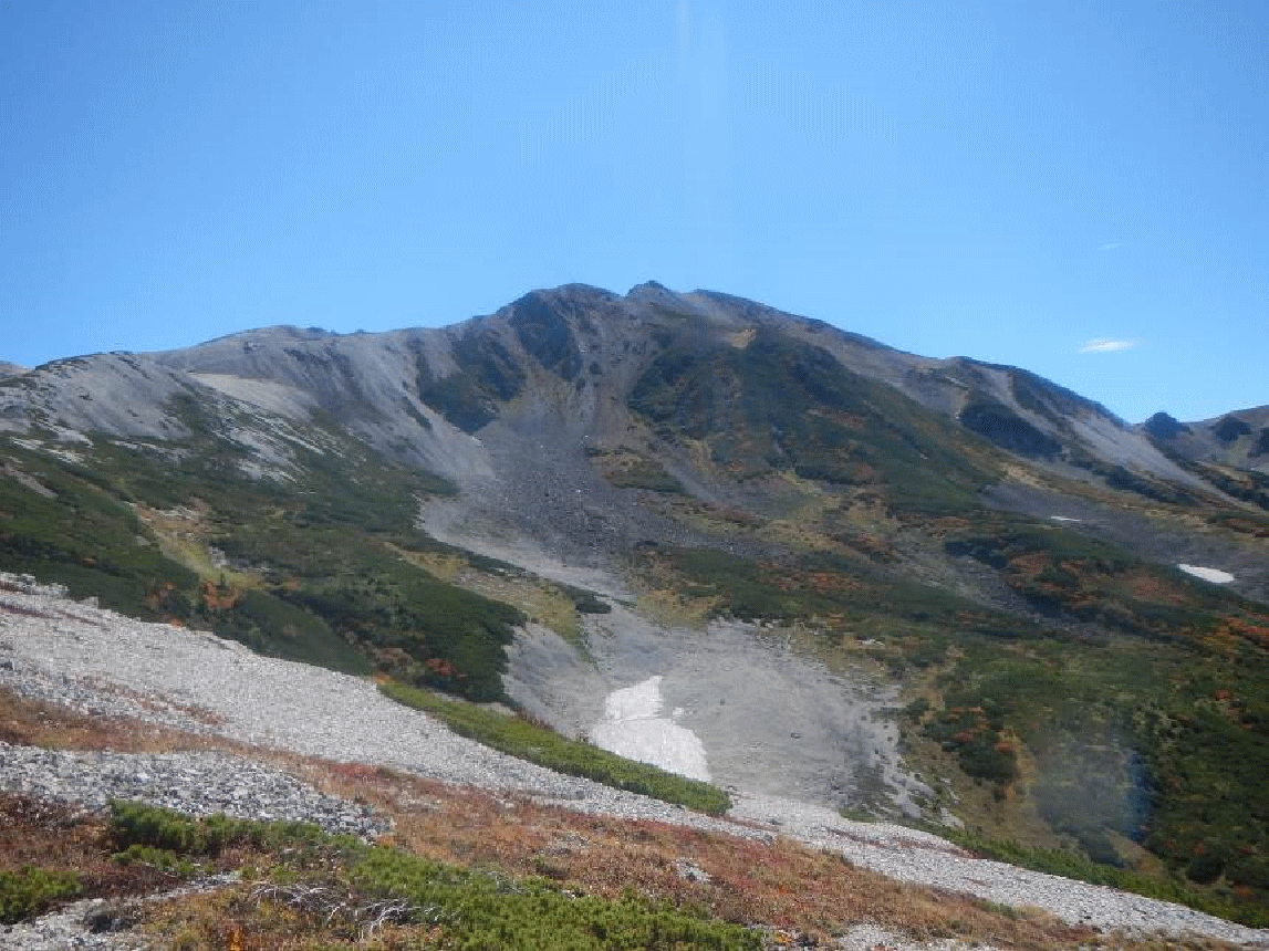 沢沿いの斜面にはトリカブトやミヤマキンポウゲ、ハクサンフウロなど、夏の花がまだ咲いていた。稜線近くはもみじなどが色づき始めており、夏の終わりと彩りの秋が入り混じっている風情を楽しめた。いつ来ても静かな鉱山道。夏に歩いた清水尾根も静かな尾根だった。だからこそ白馬岳の魅力を満喫できる。