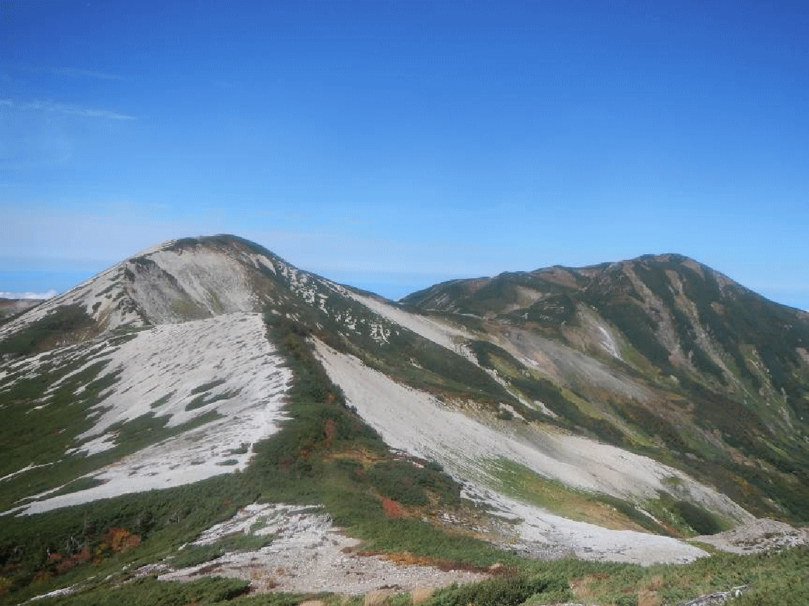 <小蓮華岳山頂。白馬岳から続く尾根の右端が清水岳。夏は高山植物が素晴らしかった>