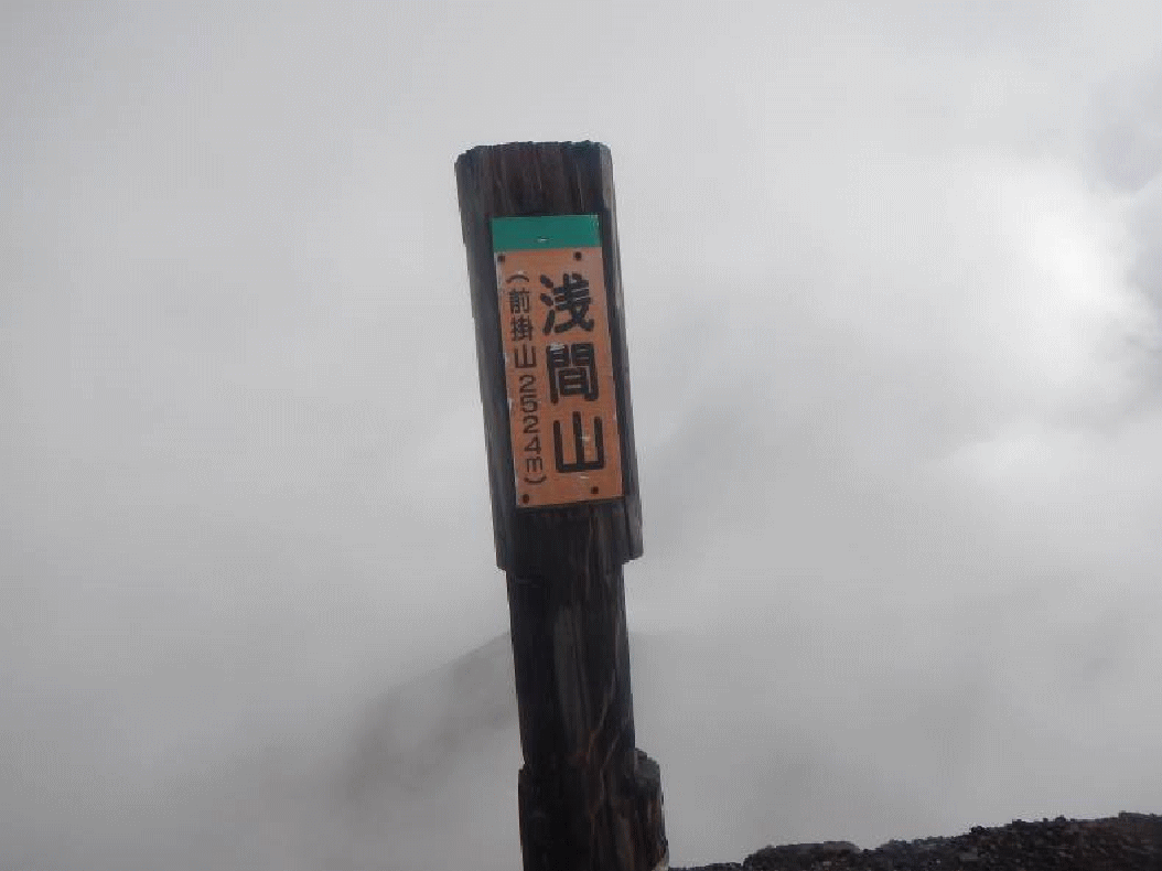 流れるガスの中、前掛山山頂に着いた。寒いのですぐに山頂を後にしたが、シェルターまで下ってきたら視界が開け、賽の河原あたりからは全容を見ることができた。下りでは次から次へと登ってくる大勢の登山者とすれ違う。さすがは100名山。そして、やはり前掛山が登れるからなのだろう。